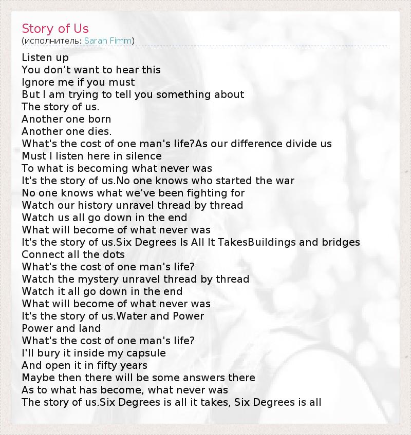 Listen up You don't want to hear this Ignore me if you must But I am trying to tell you something about The story of us. Another one born Another one dies. What's the cost of one man's life?As our difference divide us Must I listen here in silence To what is becoming what never was It's the story of us.No one knows who started the war No one knows what we've been fighting for Watch our history unravel thread by thread Watch us all go down in the end What will become of what never was It's the story of us.Six Degrees Is All It TakesBuildings and bridges Connect all the dots What's the cost of one man's life? Watch the mystery unravel thread by thread Watch it all go down in the end What will become of what never was It's the story of us.Water and Power Power and land What's the cost of one man's life? I'll bury it inside my capsule And open it in fifty years Maybe then there will be some answers there As to what has become, what never was The story of us.Six Degrees is all it takes, Six Degrees is all