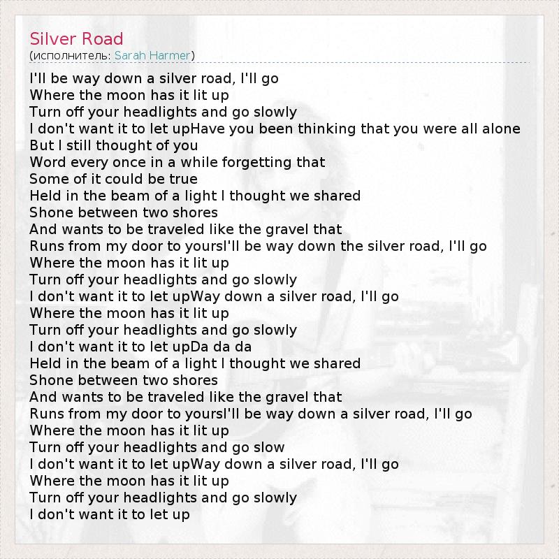 Runs from my door to yoursI'll be way down the silver road, I'll go