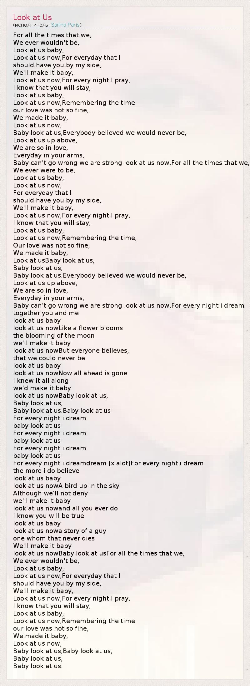 For all the times that we, We ever wouldn't be, Look at us baby, Look at us now,For everyday that I should have you by my side, We'll make it baby, Look at us now,For every night I pray, I know that you will stay, Look at us baby, Look at us now,Remembering the time our love was not so fine, We made it baby, Look at us now, Baby look at us,Everybody believed we would never be, Look at us up above, We are so in love, Everyday in your arms, Baby can't go wrong we are strong look at us now,For all the times that we, We ever were to be, Look at us baby, Look at us now, For everyday that I should have you by my side, We'll make it baby, Look at us now,For every night I pray, I know that you will stay, Look at us baby, Look at us now,Remembering the time, Our love was not so fine, We made it baby, Look at usBaby look at us, Baby look at us, Baby look at us.Everybody believed we would never be, Look at us up above, We are so in love, Everyday in your arms, Baby can't go wrong we are strong look at us now,For every night i dream together you and me look at us baby look at us nowLike a flower blooms the blooming of the moon we'll make it baby look at us nowBut everyone believes, that we could never be look at us baby look at us nowNow all ahead is gone i knew it all along we'd make it baby look at us nowBaby look at us, Baby look at us, Baby look at us.Baby look at us For every night i dream baby look at us For every night i dream baby look at us For every night i dream baby look at us For every night i dreamdream [x alot]For every night i dream the more i do believe look at us baby look at us nowA bird up in the sky Although we'll not deny we'll make it baby look at us nowand all you ever do i know you will be true look at us baby look at us nowa story of a guy one whom that never dies We'll make it baby look at us nowBaby look at usFor all the times that we, We ever wouldn't be, Look at us baby, Look at us now,For everyday that I should have you by my side, We'll make it baby, Look at us now,For every night I pray, I know that you will stay, Look at us baby, Look at us now,Remembering the time our love was not so fine, We made it baby, Look at us now, Baby look at us,Baby look at us, Baby look at us, Baby look at us.