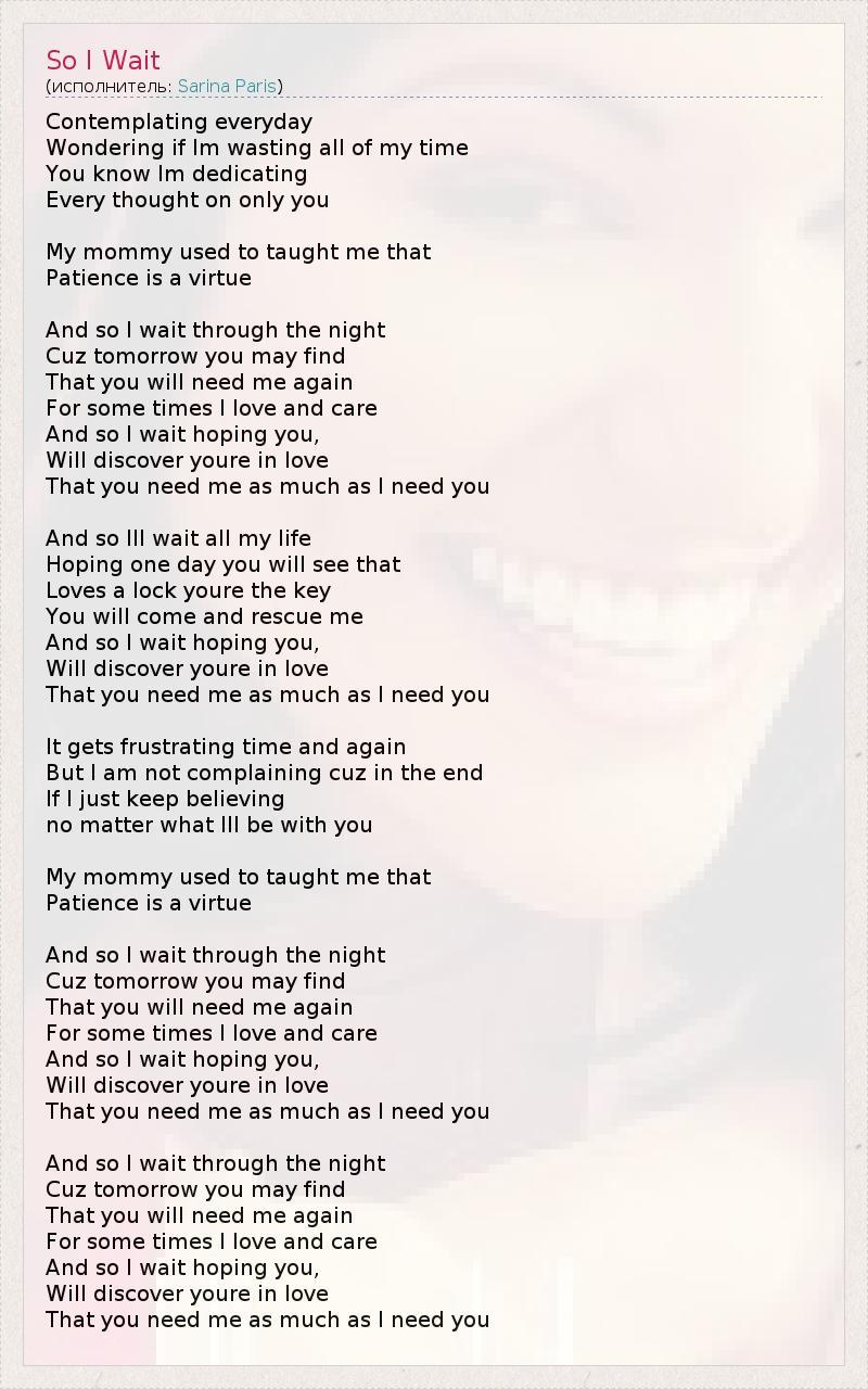 Contemplating everyday Wondering if Im wasting all of my time You know Im dedicating Every thought on only you My mommy used to taught me that Patience is a virtue And so I wait through the night Cuz tomorrow you may find That you will need me again For some times I love and care And so I wait hoping you, Will discover youre in love That you need me as much as I need you And so Ill wait all my life Hoping one day you will see that Loves a lock youre the key You will come and rescue me And so I wait hoping you, Will discover youre in love That you need me as much as I need you It gets frustrating time and again But I am not complaining cuz in the end If I just keep believing no matter what Ill be with you My mommy used to taught me that Patience is a virtue And so I wait through the night Cuz tomorrow you may find That you will need me again For some times I love and care And so I wait hoping you, Will discover youre in love That you need me as much as I need you And so I wait through the night Cuz tomorrow you may find That you will need me again For some times I love and care And so I wait hoping you, Will discover youre in love That you need me as much as I need you