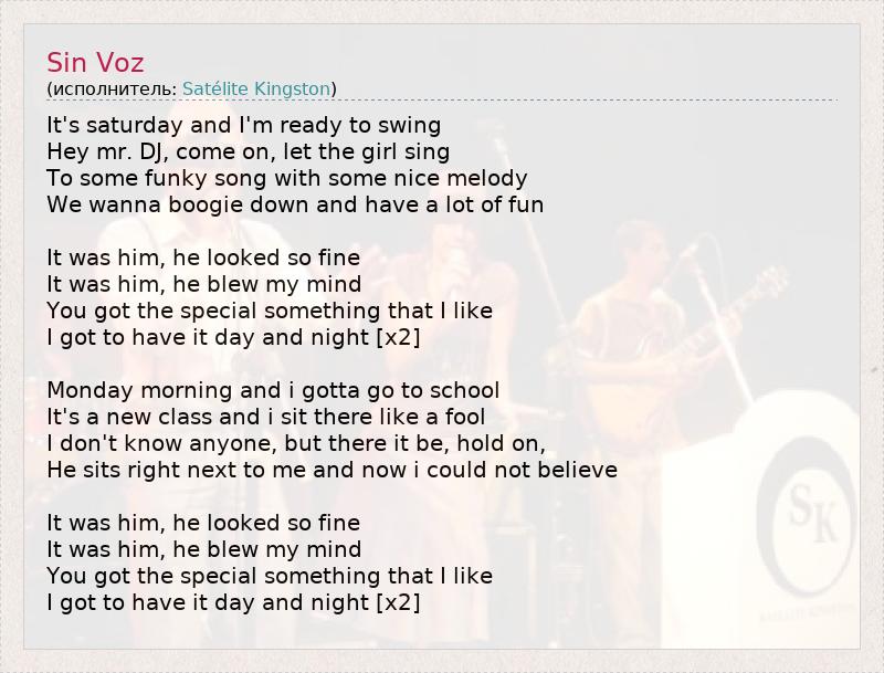 Сегодня суббота, и я хочу зажигать, Эй, мистер DJ, давай, позволь девчушке спеть Забавную песенку с приятной мелодией, Мы хотим танцевать и веселиться! Это был он, он был неотразим, Это был он, от него у меня снесло крышу... В тебе есть кое-что особенное, что мне нравится, И мне это нужно днём и ночью... [х2] Утро понедельника, и мне надо идти в школу, Я – новенькая в классе, и сижу там, как дура. Я не знаю никого, но все же.... Держись, Он сидит рядом со мной и я не могу в это поверить! Это был он, он был неотразим, Это был он, от него у меня снесло крышу... В тебе есть кое-что особенное, что мне нравится, И мне это нужно днём и ночью... [х2]