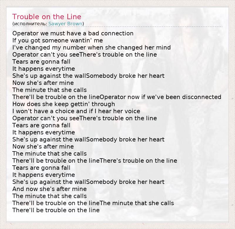 Operator we must have a bad connection If you got someone wantin' me I've changed my number when she changed her mind Operator can't you seeThere's trouble on the line Tears are gonna fall It happens everytime She's up against the wallSomebody broke her heart Now she's after mine The minute that she calls There'll be trouble on the lineOperator now if we've been disconnected How does she keep gettin' through I won't have a choice and if I hear her voice Operator can't you seeThere's trouble on the line Tears are gonna fall It happens everytime She's up against the wallSomebody broke her heart Now she's after mine The minute that she calls There'll be trouble on the lineThere's trouble on the line Tears are gonna fall It happens everytime She's up against the wallSomebody broke her heart And now she's after mine The minute that she calls There'll be trouble on the lineThe minute that she calls There'll be trouble on the line