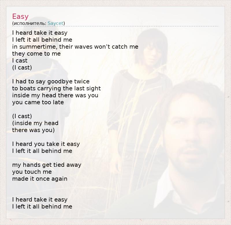 I heard take it easy I left it all behind me in summertime, their waves won't catch me they come to me I cast (I cast) I had to say goodbye twice to boats carrying the last sight inside my head there was you you came too late (I cast) (inside my head there was you) I heard you take it easy I left it all behind me my hands get tied away you touch me made it once again I heard take it easy I left it all behind me