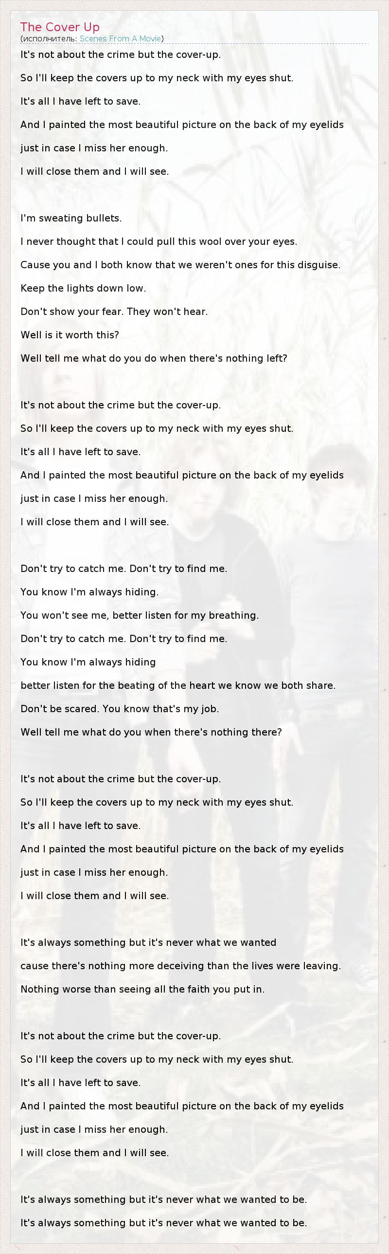 It's not about the crime but the cover-up. So I'll keep the covers up to my neck with my eyes shut. It's all I have left to save. And I painted the most beautiful picture on the back of my eyelids just in case I miss her enough. I will close them and I will see. I'm sweating bullets. I never thought that I could pull this wool over your eyes. Cause you and I both know that we weren't ones for this disguise. Keep the lights down low. Don't show your fear. They won't hear. Well is it worth this? Well tell me what do you do when there's nothing left? It's not about the crime but the cover-up. So I'll keep the covers up to my neck with my eyes shut. It's all I have left to save. And I painted the most beautiful picture on the back of my eyelids just in case I miss her enough. I will close them and I will see. Don't try to catch me. Don't try to find me. You know I'm always hiding. You won't see me, better listen for my breathing. Don't try to catch me. Don't try to find me. You know I'm always hiding better listen for the beating of the heart we know we both share. Don't be scared. You know that's my job. Well tell me what do you when there's nothing there? It's not about the crime but the cover-up. So I'll keep the covers up to my neck with my eyes shut. It's all I have left to save. And I painted the most beautiful picture on the back of my eyelids just in case I miss her enough. I will close them and I will see. It's always something but it's never what we wanted cause there's nothing more deceiving than the lives were leaving. Nothing worse than seeing all the faith you put in. It's not about the crime but the cover-up. So I'll keep the covers up to my neck with my eyes shut. It's all I have left to save. And I painted the most beautiful picture on the back of my eyelids just in case I miss her enough. I will close them and I will see. It's always something but it's never what we wanted to be. It's always something but it's never what we wanted to be.