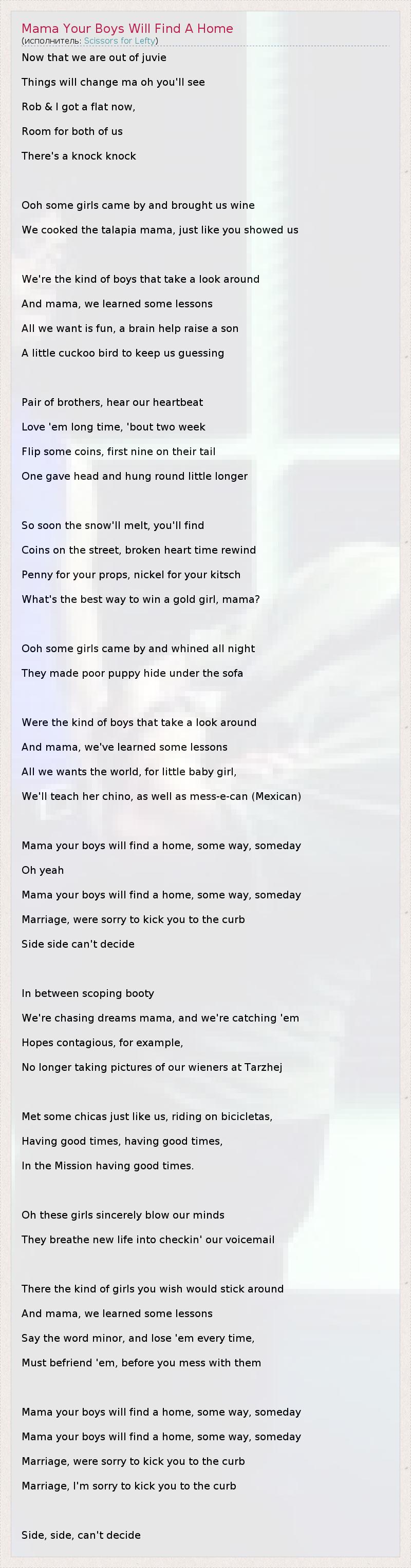 ГлавнаяИсполнителиScissors for LeftyMama Your Boys Will Find A Home