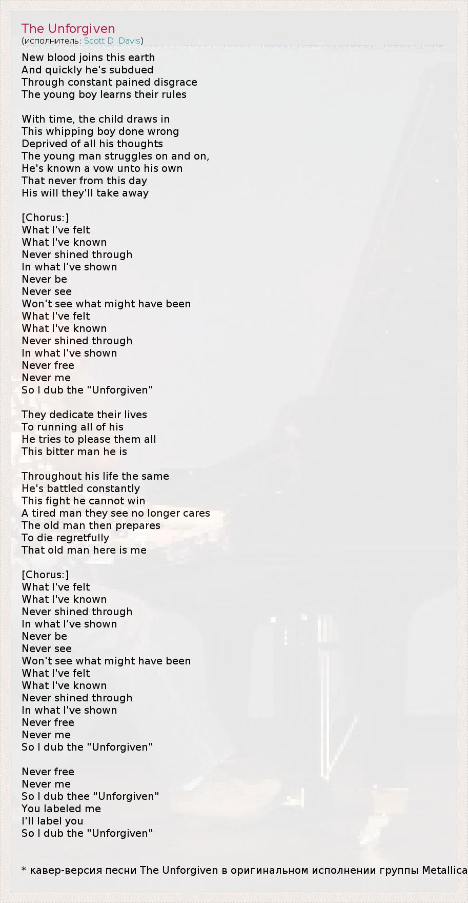 New blood joins this earth And quickly he's subdued Through constant pained disgrace The young boy learns their rules With time, the child draws in This whipping boy done wrong Deprived of all his thoughts The young man struggles on and on, He's known a vow unto his own That never from this day His will they'll take away [Chorus:] What I've felt What I've known Never shined through In what I've shown Never be Never see Won't see what might have been What I've felt What I've known Never shined through In what I've shown Never free Never me So I dub the "Unforgiven" They dedicate their lives To running all of his He tries to please them all This bitter man he is Throughout his life the same He's battled constantly This fight he cannot win A tired man they see no longer cares The old man then prepares To die regretfully That old man here is me [Chorus:] What I've felt What I've known Never shined through In what I've shown Never be Never see Won't see what might have been What I've felt What I've known Never shined through In what I've shown Never free Never me So I dub the "Unforgiven" Never free Never me So I dub thee "Unforgiven" You labeled me I'll label you So I dub the "Unforgiven" * кавер-версия песни The Unforgiven в оригинальном исполнении группы Metallica