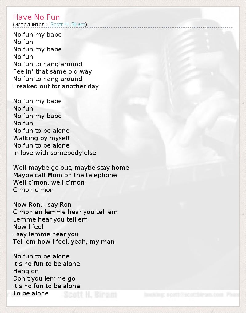 No fun my babe No fun No fun my babe No fun No fun to hang around Feelin' that same old way No fun to hang around Freaked out for another day No fun my babe No fun No fun my babe No fun No fun to be alone Walking by myself No fun to be alone In love with somebody else Well maybe go out, maybe stay home Maybe call Mom on the telephone Well c'mon, well c'mon C'mon c'mon Now Ron, I say Ron C'mon an lemme hear you tell em Lemme hear you tell em Now I feel I say lemme hear you Tell em how I feel, yeah, my man No fun to be alone It's no fun to be alone Hang on Don't you lemme go It's no fun to be alone To be alone