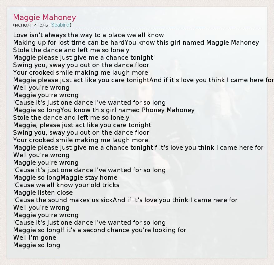 Love isn't always the way to a place we all know Making up for lost time can be hardYou know this girl named Maggie Mahoney Stole the dance and left me so lonely Maggie please just give me a chance tonight Swing you, sway you out on the dance floor Your crooked smile making me laugh more Maggie please just act like you care tonightAnd if it's love you think I came here for Well you're wrong Maggie you're wrong 'Cause it's just one dance I've wanted for so long Maggie so longYou know this girl named Phoney Mahoney Stole the dance and left me so lonely Maggie, please just act like you care tonight Swing you, sway you out on the dance floor Your crooked smile making me laugh more Maggie please just give me a chance tonightIf it's love you think I came here for Well you're wrong Maggie you're wrong 'Cause it's just one dance I've wanted for so long Maggie so longMaggie stay home 'Cause we all know your old tricks Maggie listen close 'Cause the sound makes us sickAnd if it's love you think I came here for Well you're wrong Maggie you're wrong 'Cause it's just one dance I've wanted for so long Maggie so longIf it's a second chance you're looking for Well I'm gone Maggie so long