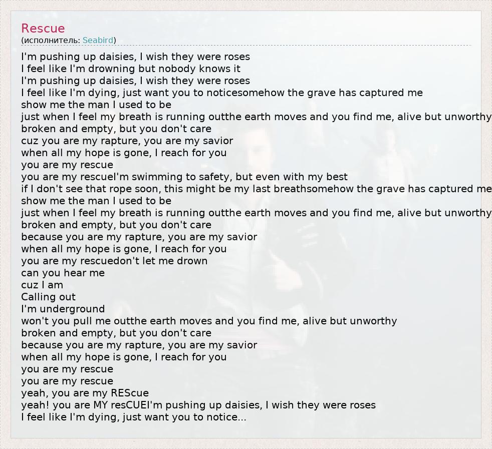 I'm pushing up daisies, I wish they were roses I feel like I'm drowning but nobody knows it I'm pushing up daisies, I wish they were roses I feel like I'm dying, just want you to noticesomehow the grave has captured me show me the man I used to be just when I feel my breath is running outthe earth moves and you find me, alive but unworthy broken and empty, but you don't care cuz you are my rapture, you are my savior when all my hope is gone, I reach for you you are my rescue you are my rescueI'm swimming to safety, but even with my best if I don't see that rope soon, this might be my last breathsomehow the grave has captured me show me the man I used to be just when I feel my breath is running outthe earth moves and you find me, alive but unworthy broken and empty, but you don't care because you are my rapture, you are my savior when all my hope is gone, I reach for you you are my rescuedon't let me drown can you hear me cuz I am Calling out I'm underground won't you pull me outthe earth moves and you find me, alive but unworthy broken and empty, but you don't care because you are my rapture, you are my savior when all my hope is gone, I reach for you you are my rescue you are my rescue yeah, you are my REScue yeah! you are MY resCUEI'm pushing up daisies, I wish they were roses I feel like I'm dying, just want you to notice...
