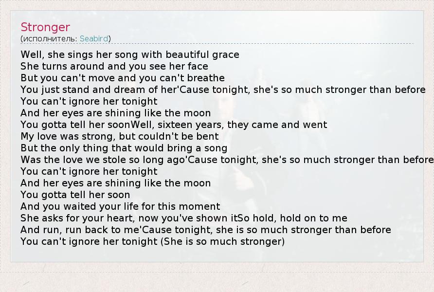 And run, run back to me'Cause tonight, she is so much stronger than before