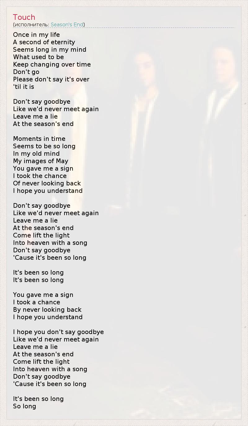Первый раз в моей жизни Секунда вечности Кажется мне такой длинной. То, что было, Меняется с течением времени. Не уходи, Пожалуйста, не говори, что всё закончено, Пока это есть... Не прощайся так, Будто мы больше не увидимся. Оставь мне ложь В конце нашей поры. Мгновения, Кажется, длятся так долго... В моём потрёпанном разуме - Мои воспоминания о мае. Ты подала мне знак, Я воспользовался шансом Никогда не смотреть назад. Я надеюсь, что ты понимаешь... Не прощайся так, Будто мы больше не увидимся. Оставь мне ложь В конце нашей поры. Приди, зажги свет В небесах – своей песней. Не говори "Прощай", Ведь это длилось так долго... Длилось так долго... Длилось так долго... Ты подала мне знак, Я воспользовался шансом, Никогда не оглядываясь назад. Я надеюсь, что ты понимаешь... Я надеюсь, что ты не прощаешься так, Будто мы не увидимся снова! Оставь мне ложь В конце нашей поры. Приди, зажги свет В небесах – своей песней. Не говори "Прощай", Ведь это длилось так долго... Это длилось так долго... Так долго...