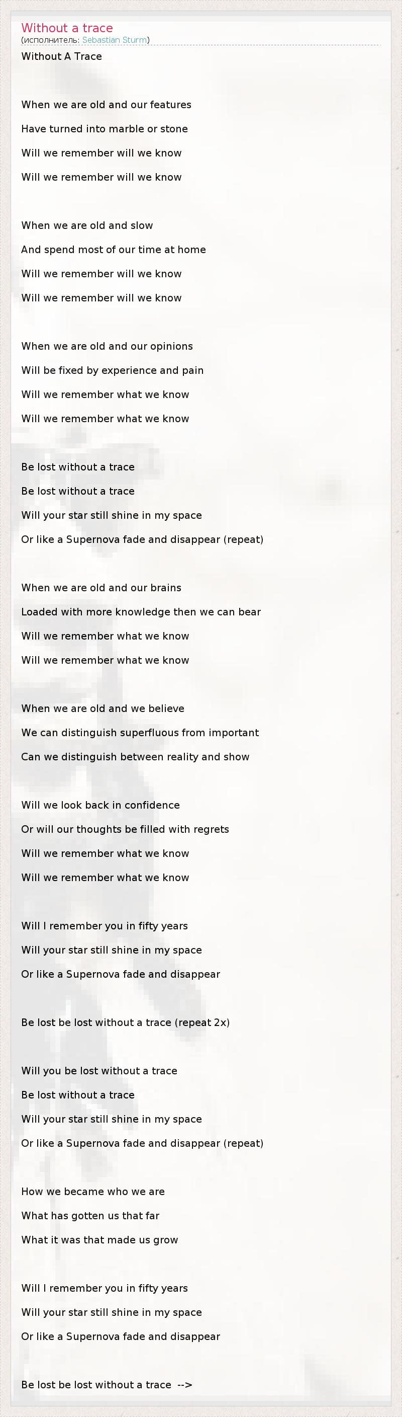 Without A Trace When we are old and our features Have turned into marble or stone Will we remember will we know Will we remember will we know When we are old and slow And spend most of our time at home Will we remember will we know Will we remember will we know When we are old and our opinions Will be fixed by experience and pain Will we remember what we know Will we remember what we know Be lost without a trace Be lost without a trace Will your star still shine in my space Or like a Supernova fade and disappear (repeat) When we are old and our brains Loaded with more knowledge then we can bear Will we remember what we know Will we remember what we know When we are old and we believe We can distinguish superfluous from important Can we distinguish between reality and show Will we look back in confidence Or will our thoughts be filled with regrets Will we remember what we know Will we remember what we know Will I remember you in fifty years Will your star still shine in my space Or like a Supernova fade and disappear Be lost be lost without a trace (repeat 2x) Will you be lost without a trace Be lost without a trace Will your star still shine in my space Or like a Supernova fade and disappear (repeat) How we became who we are What has gotten us that far What it was that made us grow Will I remember you in fifty years Will your star still shine in my space Or like a Supernova fade and disappear Be lost be lost without a trace -->