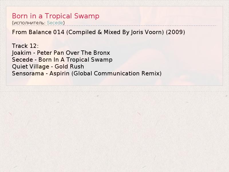 From Balance 014 (Compiled & Mixed By Joris Voorn) (2009) Track 12: Joakim - Peter Pan Over The Bronx Secede - Born In A Tropical Swamp Quiet Village - Gold Rush Sensorama - Aspirin (Global Communication Remix)