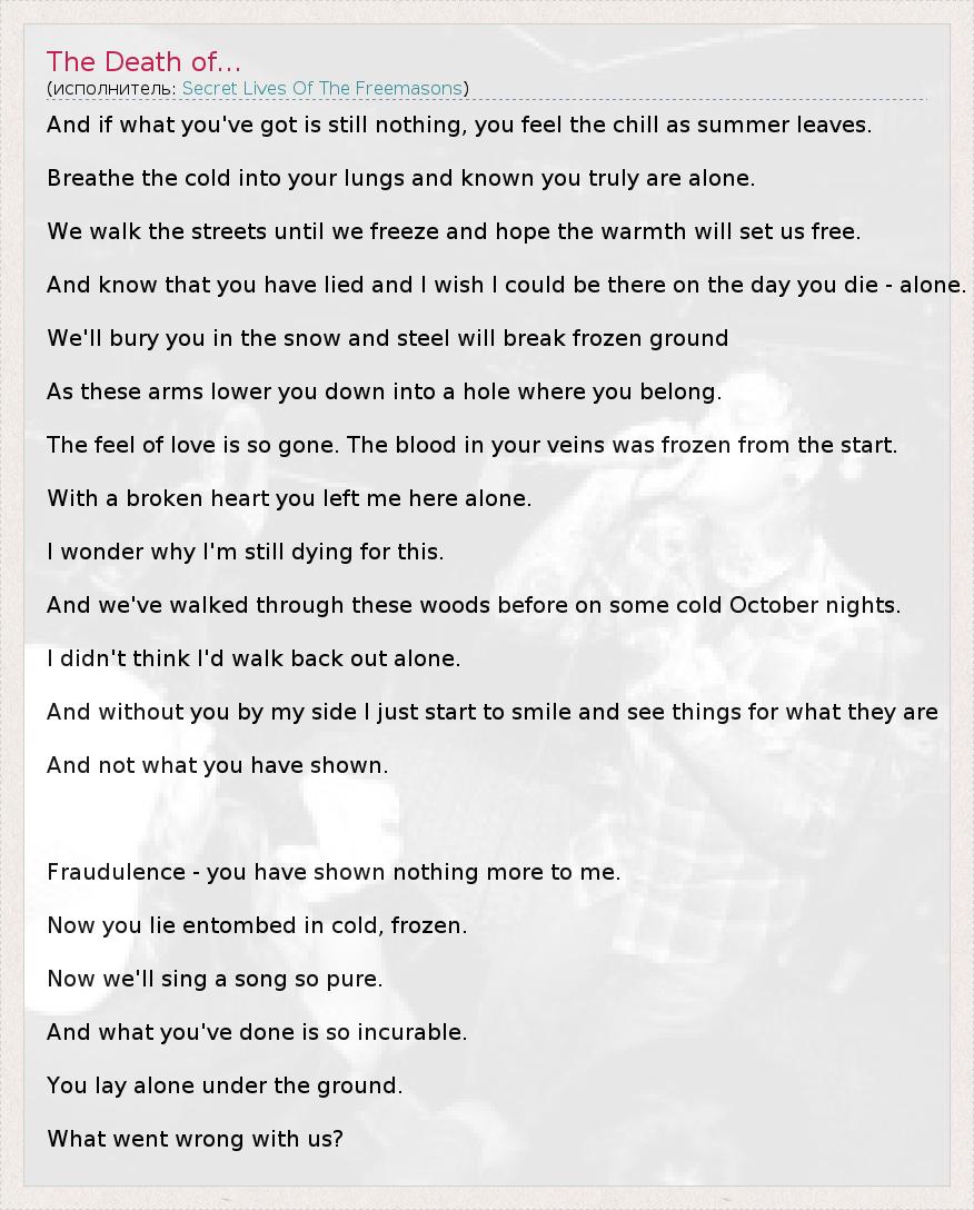 And if what you've got is still nothing, you feel the chill as summer leaves. Breathe the cold into your lungs and known you truly are alone. We walk the streets until we freeze and hope the warmth will set us free. And know that you have lied and I wish I could be there on the day you die - alone. We'll bury you in the snow and steel will break frozen ground As these arms lower you down into a hole where you belong. The feel of love is so gone. The blood in your veins was frozen from the start. With a broken heart you left me here alone. I wonder why I'm still dying for this. And we've walked through these woods before on some cold October nights. I didn't think I'd walk back out alone. And without you by my side I just start to smile and see things for what they are And not what you have shown. Fraudulence - you have shown nothing more to me. Now you lie entombed in cold, frozen. Now we'll sing a song so pure. And what you've done is so incurable. You lay alone under the ground. What went wrong with us?