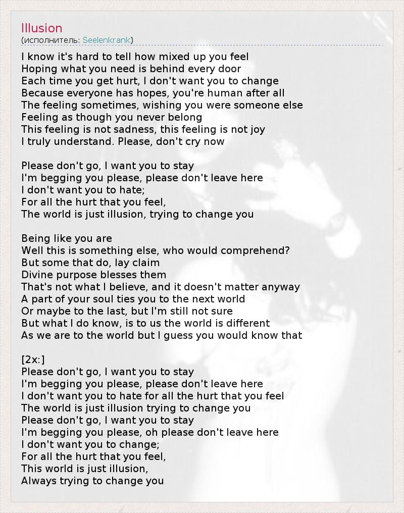 Я знаю, сложно понять, какая сумятица у тебя в душе, Тешащего себя надеждой, что необходимое тебе спрятано за каждой дверью. Каждый раз, когда тебе больно, я не хочу, чтобы ты менялся, Потому что каждый надеется. В конце концов, ты же человек. Иногда ты чувствуешь, что хочешь быть кем-то другим, Что ты никому не принадлежишь. Это чувство не печаль, но и не радость. Я правда тебя понимаю. Пожалуйста, не плачь сейчас. Пожалуйста, не уходи, я хочу, чтобы ты остался. Я умоляю тебя - не уходи, пожалуйста. Я не хочу, чтобы ты ненавидел За ту боль, что испытываешь. Этот мир - всего лишь иллюзия, пытающаяся изменить тебя. Твоё истинное Я - Это нечто другое. Разве кто поймёт? Но те, что понимают, предъявляют права. И божественная цель благословляет их. Не в это я верю, хотя в любом случае это не важно. Часть твоей души связывает тебя с другим миром, А может, с последним, но я не уверена до конца. Все, что я знаю - для нас двоих мир различен, Как и мы для него. Но полагаю, ты об этом догадываешься... [2x:] Пожалуйста, не уходи. Я хочу, чтобы ты остался. Я умоляю тебя, пожалуйста, пожалуйста, не уходи отсюда. Я не хочу, чтобы ты ненавидел за ту боль, что испытываешь. Этот мир - всего лишь иллюзия, которая пытается тебя изменить. Пожалуйста, не уходи, я хочу, чтобы ты остался. Я умоляю тебя, о, пожалуйста, не уходи отсюда. Я не хочу, чтобы ты изменялся Из-за всей боли, что ты ощущаешь. Этот мир - всего лишь иллюзия, Которая всегда пытается тебя изменить.