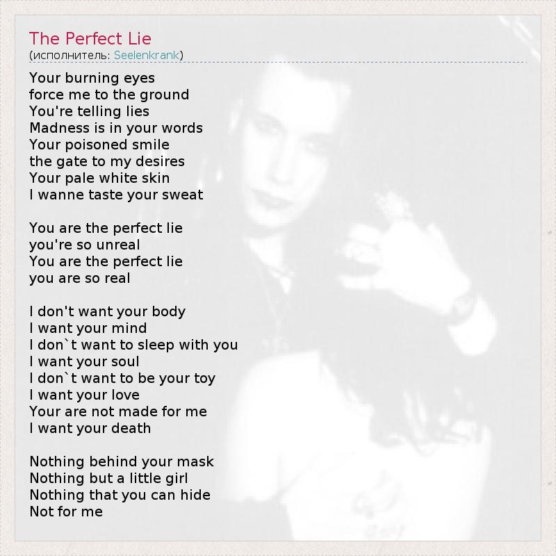 Ваши горящие глаза заставить меня на землю Ты говоришь ложь Безумие в ваших словах Ваш отравлен улыбка ворота в моих желаний Ваш бледно белая кожа Я Wanne вкус ваш пот Вы идеальный ложь ты так нереально Вы идеальный ложь Вы настолько реальны Я не хочу свое тело Я хочу свой ум Я Если вы не хотите спать с тобой Я хочу твою душу Я не `т хочу быть твоим игрушка Я хочу твоей любви Ваш не сделал для меня Я хочу вашей смерти Ничего за вашей маской Ничего, кроме маленькой девочки Ничего, что можно скрыть Не для меня