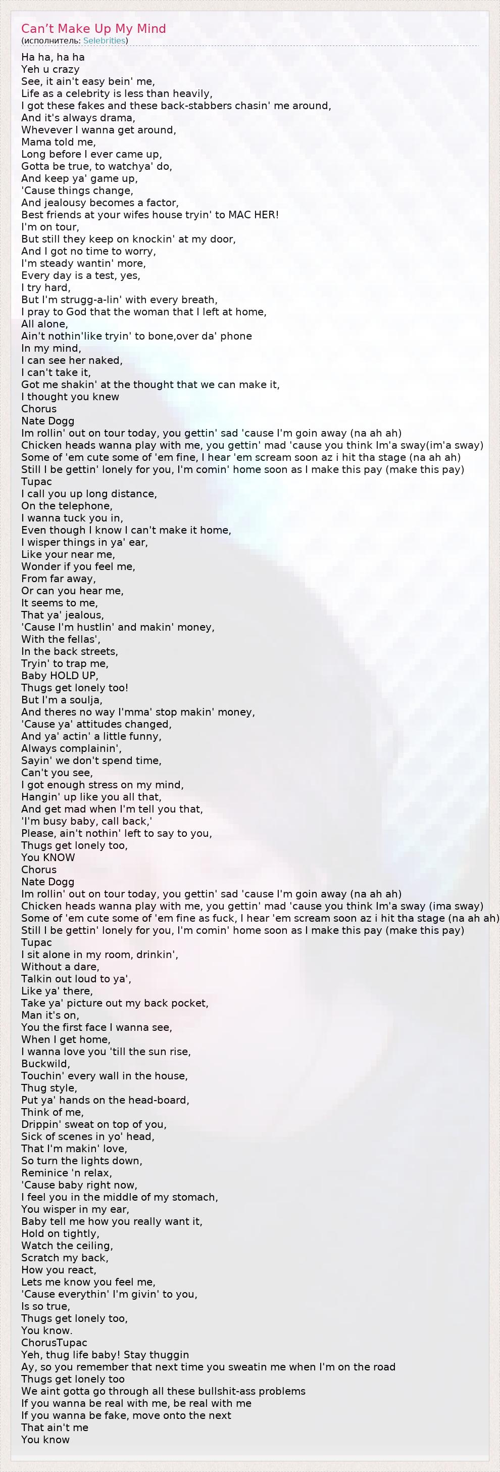 Ha ha, ha ha Yeh u crazy See, it ain't easy bein' me, Life as a celebrity is less than heavily, I got these fakes and these back-stabbers chasin' me around, And it's always drama, Whevever I wanna get around, Mama told me, Long before I ever came up, Gotta be true, to watchya' do, And keep ya' game up, 'Cause things change, And jealousy becomes a factor, Best friends at your wifes house tryin' to MAC HER! I'm on tour, But still they keep on knockin' at my door, And I got no time to worry, I'm steady wantin' more, Every day is a test, yes, I try hard, But I'm strugg-a-lin' with every breath, I pray to God that the woman that I left at home, All alone, Ain't nothin'like tryin' to bone,over da' phone In my mind, I can see her naked, I can't take it, Got me shakin' at the thought that we can make it, I thought you knew Chorus Nate Dogg Im rollin' out on tour today, you gettin' sad 'cause I'm goin away (na ah ah) Chicken heads wanna play with me, you gettin' mad 'cause you think Im'a sway(im'a sway) Some of 'em cute some of 'em fine, I hear 'em scream soon az i hit tha stage (na ah ah) Still I be gettin' lonely for you, I'm comin' home soon as I make this pay (make this pay) Tupac I call you up long distance, On the telephone, I wanna tuck you in, Even though I know I can't make it home, I wisper things in ya' ear, Like your near me, Wonder if you feel me, From far away, Or can you hear me, It seems to me, That ya' jealous, 'Cause I'm hustlin' and makin' money, With the fellas', In the back streets, Tryin' to trap me, Baby HOLD UP, Thugs get lonely too! But I'm a soulja, And theres no way I'mma' stop makin' money, 'Cause ya' attitudes changed, And ya' actin' a little funny, Always complainin', Sayin' we don't spend time, Can't you see, I got enough stress on my mind, Hangin' up like you all that, And get mad when I'm tell you that, 'I'm busy baby, call back,' Please, ain't nothin' left to say to you, Thugs get lonely too, You KNOW Chorus Nate Dogg Im rollin' out on tour today, you gettin' sad 'cause I'm goin away (na ah ah) Chicken heads wanna play with me, you gettin' mad 'cause you think Im'a sway (ima sway) Some of 'em cute some of 'em fine as fuck, I hear 'em scream soon az i hit tha stage (na ah ah) Still I be gettin' lonely for you, I'm comin' home soon as I make this pay (make this pay) Tupac I sit alone in my room, drinkin', Without a dare, Talkin out loud to ya', Like ya' there, Take ya' picture out my back pocket, Man it's on, You the first face I wanna see, When I get home, I wanna love you 'till the sun rise, Buckwild, Touchin' every wall in the house, Thug style, Put ya' hands on the head-board, Think of me, Drippin' sweat on top of you, Sick of scenes in yo' head, That I'm makin' love, So turn the lights down, Reminice 'n relax, 'Cause baby right now, I feel you in the middle of my stomach, You wisper in my ear, Baby tell me how you really want it, Hold on tightly, Watch the ceiling, Scratch my back, How you react, Lets me know you feel me, 'Cause everythin' I'm givin' to you, Is so true, Thugs get lonely too, You know. ChorusTupac Yeh, thug life baby! Stay thuggin Ay, so you remember that next time you sweatin me when I'm on the road Thugs get lonely too We aint gotta go through all these bullshit-ass problems If you wanna be real with me, be real with me If you wanna be fake, move onto the next That ain't me You know