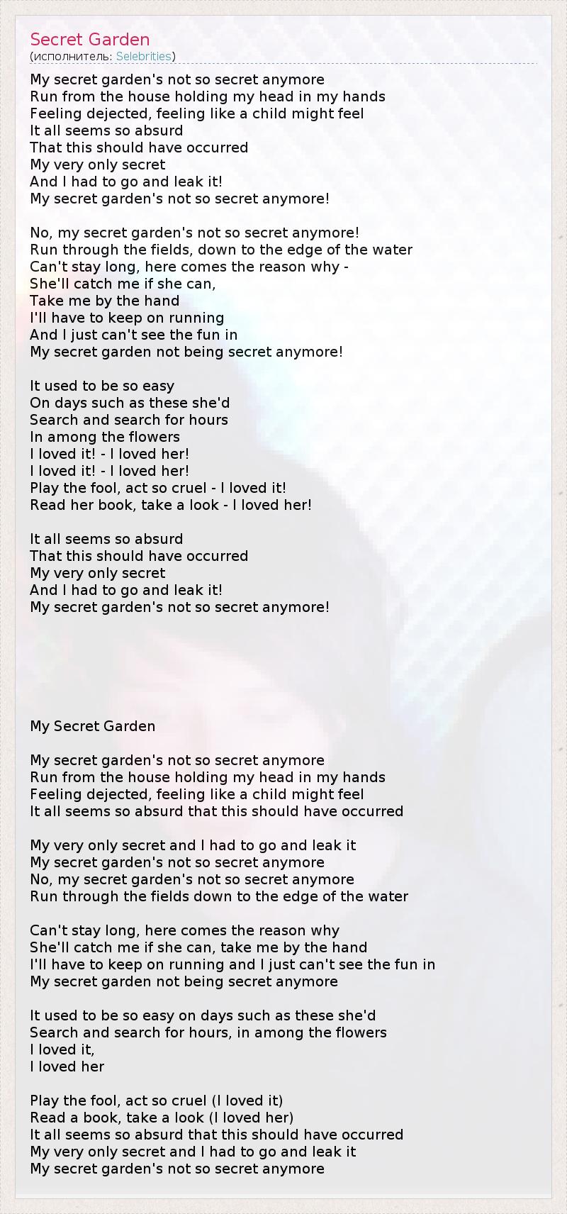My secret garden's not so secret anymore Run from the house holding my head in my hands Feeling dejected, feeling like a child might feel It all seems so absurd That this should have occurred My very only secret And I had to go and leak it! My secret garden's not so secret anymore! No, my secret garden's not so secret anymore! Run through the fields, down to the edge of the water Can't stay long, here comes the reason why - She'll catch me if she can, Take me by the hand I'll have to keep on running And I just can't see the fun in My secret garden not being secret anymore! It used to be so easy On days such as these she'd Search and search for hours In among the flowers I loved it! - I loved her! I loved it! - I loved her! Play the fool, act so cruel - I loved it! Read her book, take a look - I loved her! It all seems so absurd That this should have occurred My very only secret And I had to go and leak it! My secret garden's not so secret anymore! My Secret Garden My secret garden's not so secret anymore Run from the house holding my head in my hands Feeling dejected, feeling like a child might feel It all seems so absurd that this should have occurred My very only secret and I had to go and leak it My secret garden's not so secret anymore No, my secret garden's not so secret anymore Run through the fields down to the edge of the water Can't stay long, here comes the reason why She'll catch me if she can, take me by the hand I'll have to keep on running and I just can't see the fun in My secret garden not being secret anymore It used to be so easy on days such as these she'd Search and search for hours, in among the flowers I loved it, I loved her Play the fool, act so cruel (I loved it) Read a book, take a look (I loved her) It all seems so absurd that this should have occurred My very only secret and I had to go and leak it My secret garden's not so secret anymore