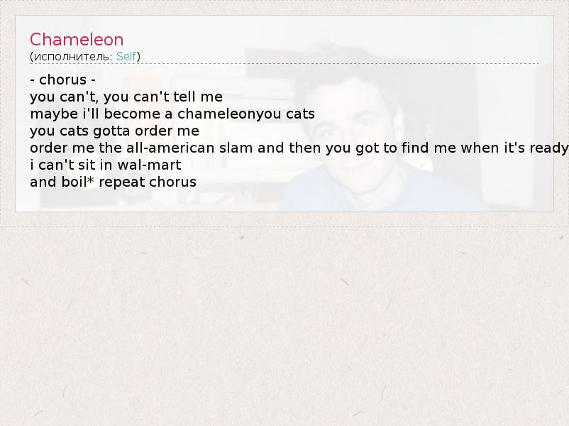 - chorus - you can't, you can't tell me maybe i'll become a chameleonyou cats you cats gotta order me order me the all-american slam and then you got to find me when it's ready i can't sit in wal-mart and boil* repeat chorus