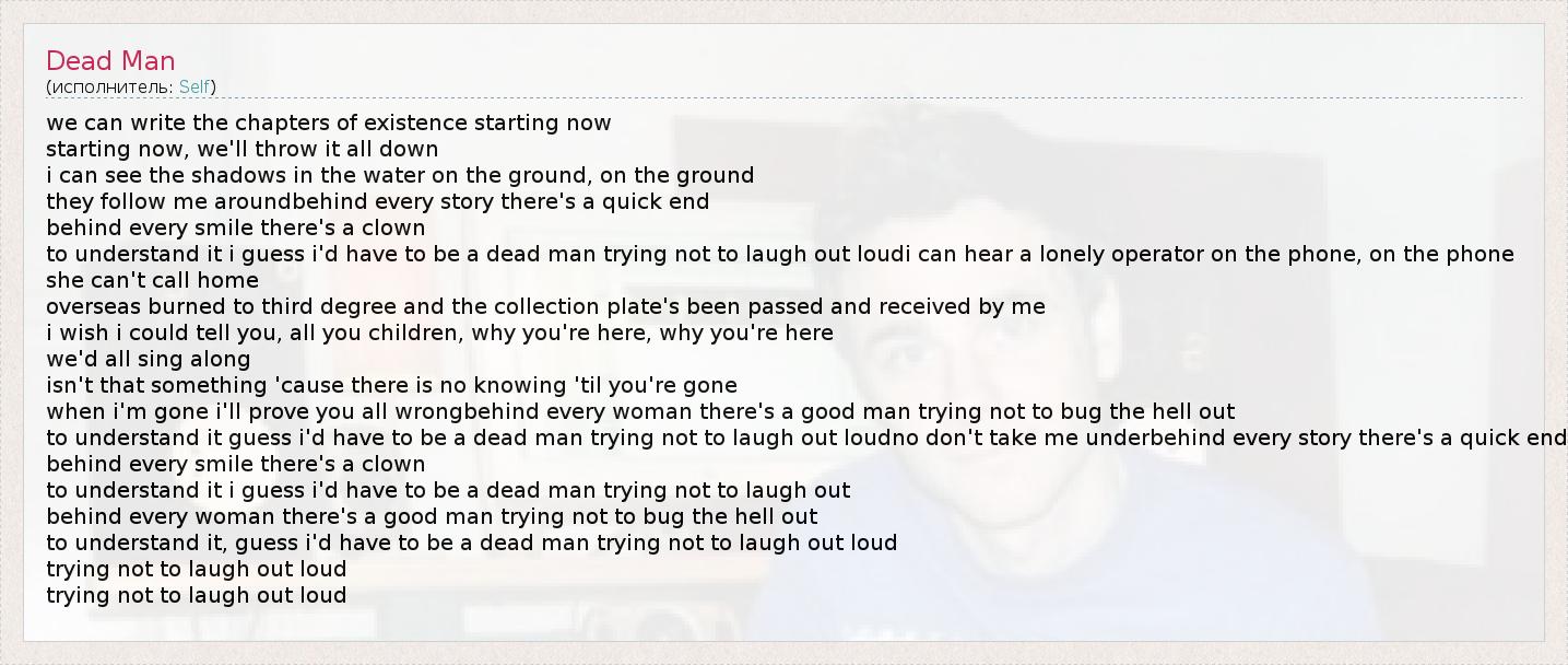 we can write the chapters of existence starting now starting now, we'll throw it all down i can see the shadows in the water on the ground, on the ground they follow me aroundbehind every story there's a quick end behind every smile there's a clown to understand it i guess i'd have to be a dead man trying not to laugh out loudi can hear a lonely operator on the phone, on the phone she can't call home overseas burned to third degree and the collection plate's been passed and received by me i wish i could tell you, all you children, why you're here, why you're here we'd all sing along isn't that something 'cause there is no knowing 'til you're gone when i'm gone i'll prove you all wrongbehind every woman there's a good man trying not to bug the hell out to understand it guess i'd have to be a dead man trying not to laugh out loudno don't take me underbehind every story there's a quick end behind every smile there's a clown to understand it i guess i'd have to be a dead man trying not to laugh out behind every woman there's a good man trying not to bug the hell out to understand it, guess i'd have to be a dead man trying not to laugh out loud trying not to laugh out loud trying not to laugh out loud