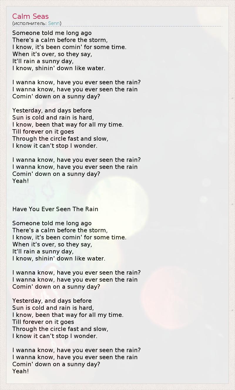 Someone told me long ago There's a calm before the storm, I know, it's been comin' for some time. When it's over, so they say, It'll rain a sunny day, I know, shinin' down like water. I wanna know, have you ever seen the rain? I wanna know, have you ever seen the rain Comin' down on a sunny day? Yesterday, and days before Sun is cold and rain is hard, I know, been that way for all my time. Till forever on it goes Through the circle fast and slow, I know it can't stop I wonder. I wanna know, have you ever seen the rain? I wanna know, have you ever seen the rain Comin' down on a sunny day? Yeah! Have You Ever Seen The Rain Someone told me long ago There's a calm before the storm, I know, it's been comin' for some time. When it's over, so they say, It'll rain a sunny day, I know, shinin' down like water. I wanna know, have you ever seen the rain? I wanna know, have you ever seen the rain Comin' down on a sunny day? Yesterday, and days before Sun is cold and rain is hard, I know, been that way for all my time. Till forever on it goes Through the circle fast and slow, I know it can't stop I wonder. I wanna know, have you ever seen the rain? I wanna know, have you ever seen the rain Comin' down on a sunny day? Yeah!