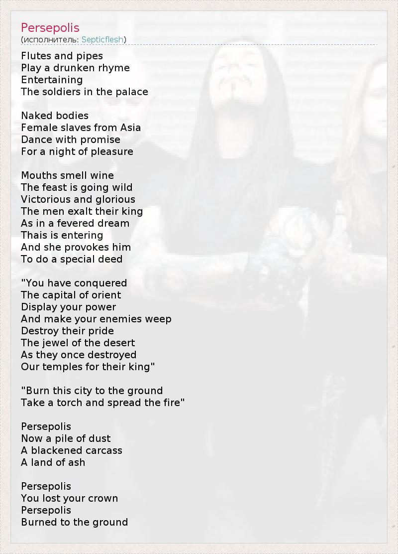 Flutes and pipes Play a drunken rhyme Entertaining The soldiers in the palace Naked bodies Female slaves from Asia Dance with promise For a night of pleasure Mouths smell wine The feast is going wild Victorious and glorious The men exalt their king As in a fevered dream Thais is entering And she provokes him To do a special deed "You have conquered The capital of orient Display your power And make your enemies weep Destroy their pride The jewel of the desert As they once destroyed Our temples for their king" "Burn this city to the ground Take a torch and spread the fire" Persepolis Now a pile of dust A blackened carcass A land of ash Persepolis You lost your crown Persepolis Burned to the ground