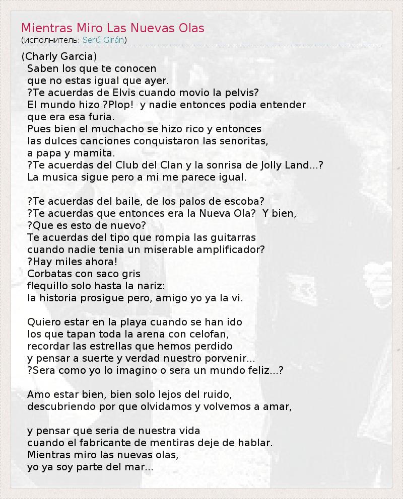 (Charly Garcia) Saben los que te conocen que no estas igual que ayer. ?Te acuerdas de Elvis cuando movio la pelvis? El mundo hizo ?Plop! y nadie entonces podia entender que era esa furia. Pues bien el muchacho se hizo rico y entonces las dulces canciones conquistaron las senoritas, a papa y mamita. ?Te acuerdas del Club del Clan y la sonrisa de Jolly Land...? La musica sigue pero a mi me parece igual. ?Te acuerdas del baile, de los palos de escoba? ?Te acuerdas que entonces era la Nueva Ola? Y bien, ?Que es esto de nuevo? Te acuerdas del tipo que rompia las guitarras cuando nadie tenia un miserable amplificador? ?Hay miles ahora! Corbatas con saco gris flequillo solo hasta la nariz: la historia prosigue pero, amigo yo ya la vi. Quiero estar en la playa cuando se han ido los que tapan toda la arena con celofan, recordar las estrellas que hemos perdido y pensar a suerte y verdad nuestro porvenir... ?Sera como yo lo imagino o sera un mundo feliz...? Amo estar bien, bien solo lejos del ruido, descubriendo por que olvidamos y volvemos a amar, y pensar que seria de nuestra vida cuando el fabricante de mentiras deje de hablar. Mientras miro las nuevas olas, yo ya soy parte del mar...