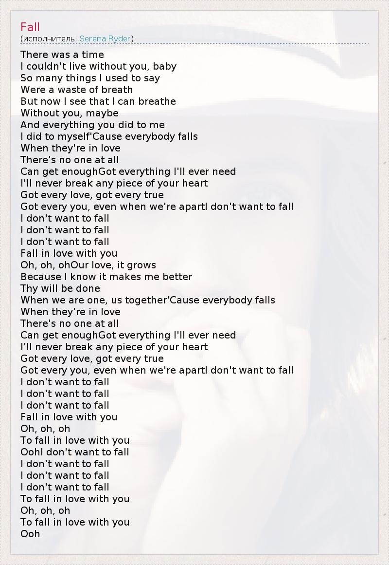 There was a time I couldn't live without you, baby So many things I used to say Were a waste of breath But now I see that I can breathe Without you, maybe And everything you did to me I did to myself'Cause everybody falls When they're in love There's no one at all Can get enoughGot everything I'll ever need I'll never break any piece of your heart Got every love, got every true Got every you, even when we're apartI don't want to fall I don't want to fall I don't want to fall I don't want to fall Fall in love with you Oh, oh, ohOur love, it grows Because I know it makes me better Thy will be done When we are one, us together'Cause everybody falls When they're in love There's no one at all Can get enoughGot everything I'll ever need I'll never break any piece of your heart Got every love, got every true Got every you, even when we're apartI don't want to fall I don't want to fall I don't want to fall I don't want to fall Fall in love with you Oh, oh, oh To fall in love with you OohI don't want to fall I don't want to fall I don't want to fall I don't want to fall To fall in love with you Oh, oh, oh To fall in love with you Ooh