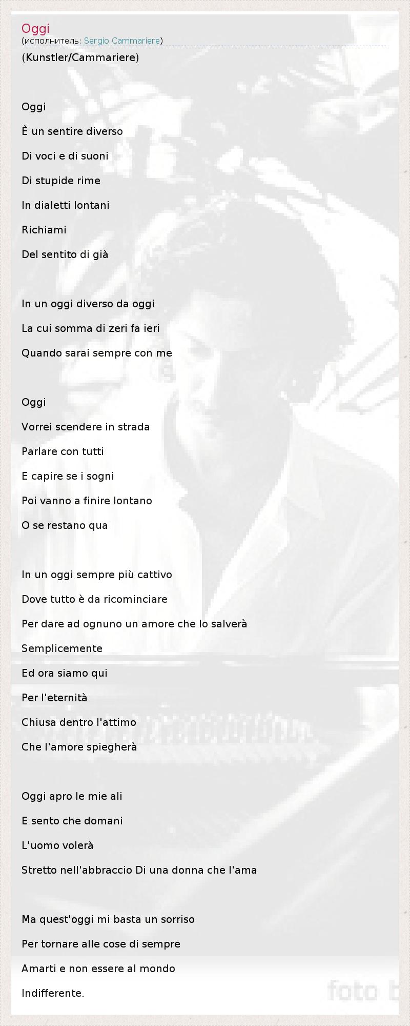 (Kunstler/Cammariere) Oggi È un sentire diverso Di voci e di suoni Di stupide rime In dialetti lontani Richiami Del sentito di già In un oggi diverso da oggi La cui somma di zeri fa ieri Quando sarai sempre con me Oggi Vorrei scendere in strada Parlare con tutti E capire se i sogni Poi vanno a finire lontano O se restano qua In un oggi sempre più cattivo Dove tutto è da ricominciare Per dare ad ognuno un amore che lo salverà Semplicemente Ed ora siamo qui Per l'eternità Chiusa dentro l'attimo Che l'amore spiegherà Oggi apro le mie ali E sento che domani L'uomo volerà Stretto nell'abbraccio Di una donna che l'ama Ma quest'oggi mi basta un sorriso Per tornare alle cose di sempre Amarti e non essere al mondo Indifferente.