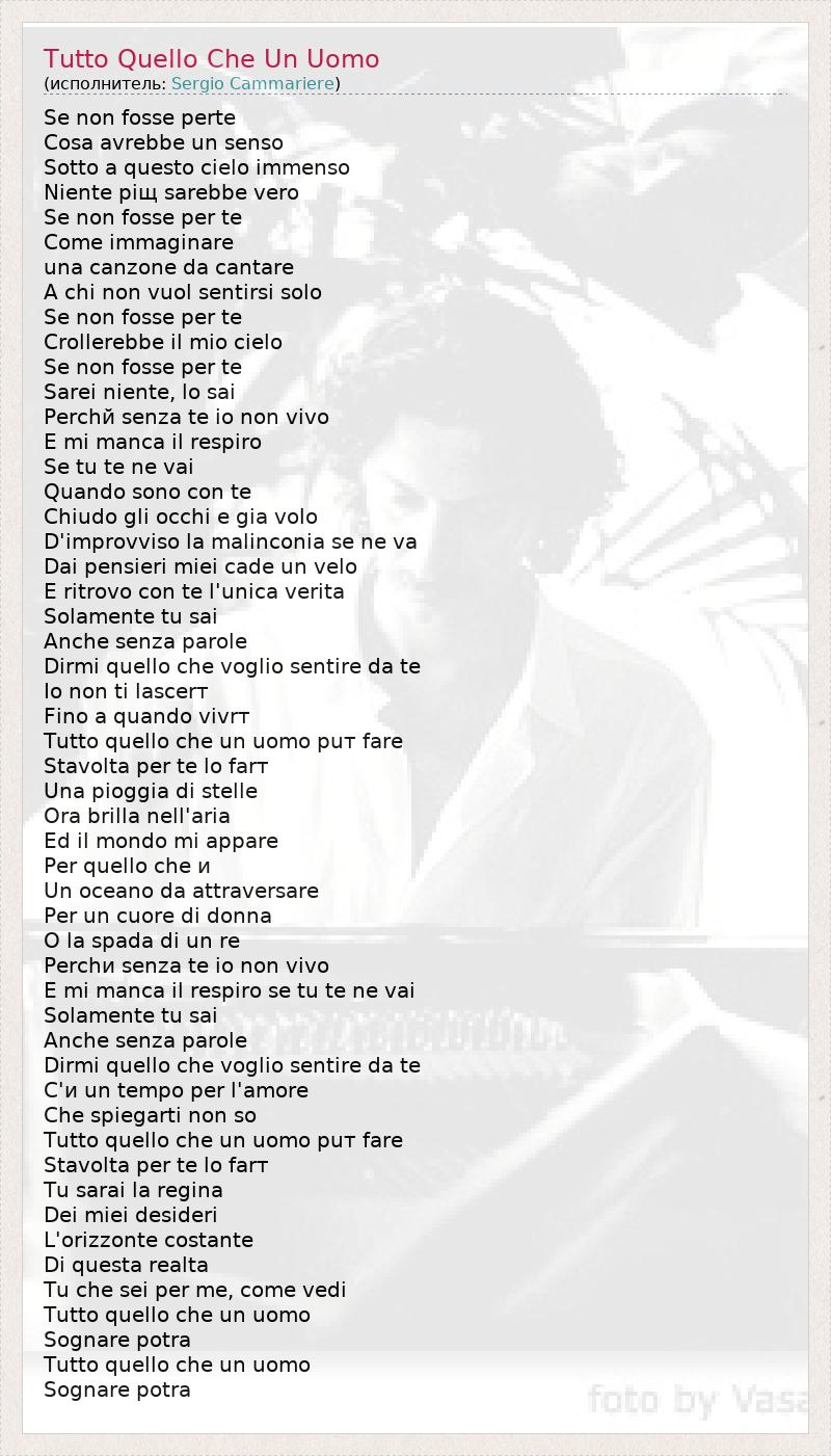 Se non fosse perte Cosa avrebbe un senso Sotto a questo cielo immenso Niente piщ sarebbe vero Se non fosse per te Come immaginare una canzone da cantare A chi non vuol sentirsi solo Se non fosse per te Crollerebbe il mio cielo Se non fosse per te Sarei niente, lo sai Perchй senza te io non vivo E mi manca il respiro Se tu te ne vai Quando sono con te Chiudo gli occhi e giа volo D'improvviso la malinconia se ne va Dai pensieri miei cade un velo E ritrovo con te l'unica veritа Solamente tu sai Anche senza parole Dirmi quello che voglio sentire da te Io non ti lascerт Fino a quando vivrт Tutto quello che un uomo puт fare Stavolta per te lo farт Una pioggia di stelle Ora brilla nell'aria Ed il mondo mi appare Per quello che и Un oceano da attraversare Per un cuore di donna O la spada di un re Perchи senza te io non vivo E mi manca il respiro se tu te ne vai Solamente tu sai Anche senza parole Dirmi quello che voglio sentire da te C'и un tempo per l'amore Che spiegarti non so Tutto quello che un uomo puт fare Stavolta per te lo farт Tu sarai la regina Dei miei desideri L'orizzonte costante Di questa realtа Tu che sei per me, come vedi Tutto quello che un uomo Sognare potrа Tutto quello che un uomo Sognare potrа