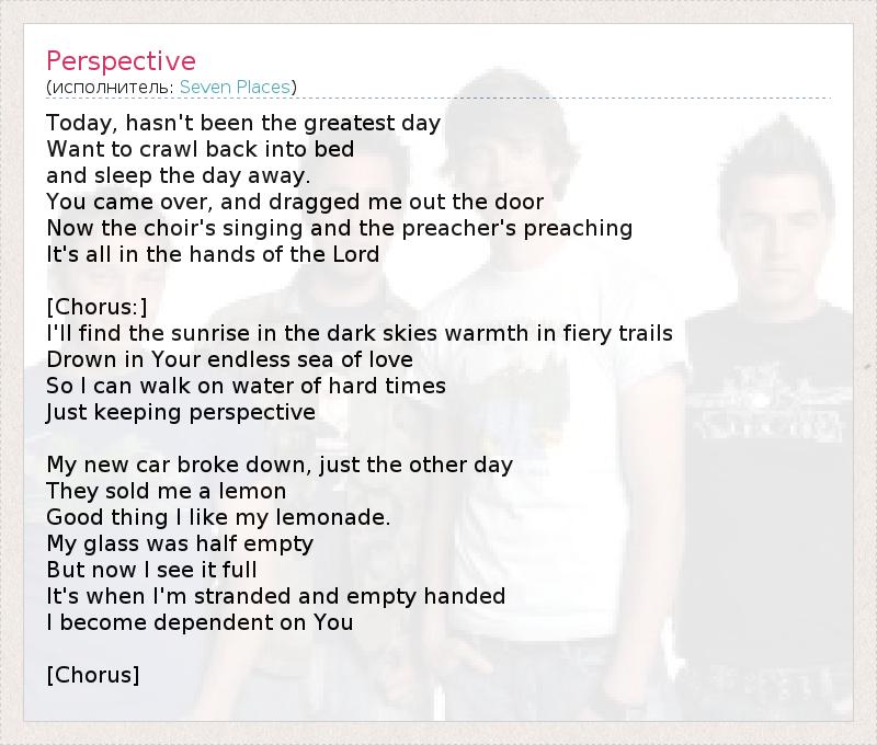 Today, hasn't been the greatest day Want to crawl back into bed and sleep the day away. You came over, and dragged me out the door Now the choir's singing and the preacher's preaching It's all in the hands of the Lord [Chorus:] I'll find the sunrise in the dark skies warmth in fiery trails Drown in Your endless sea of love So I can walk on water of hard times Just keeping perspective My new car broke down, just the other day They sold me a lemon Good thing I like my lemonade. My glass was half empty But now I see it full It's when I'm stranded and empty handed I become dependent on You [Chorus]