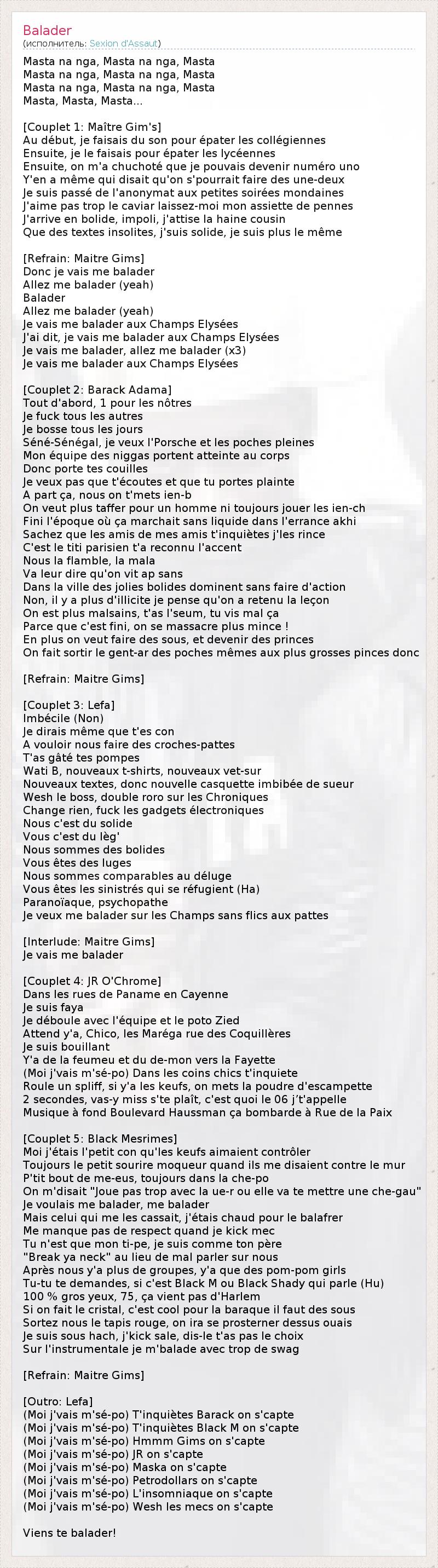 Masta na nga, Masta na nga, Masta Masta na nga, Masta na nga, Masta Masta na nga, Masta na nga, Masta Masta, Masta, Masta... [Couplet 1: Maître Gim's] Au début, je faisais du son pour épater les collégiennes Ensuite, je le faisais pour épater les lycéennes Ensuite, on m'a chuchoté que je pouvais devenir numéro uno Y'en a même qui disait qu'on s'pourrait faire des une-deux Je suis passé de l'anonymat aux petites soirées mondaines J'aime pas trop le caviar laissez-moi mon assiette de pennes J'arrive en bolide, impoli, j'attise la haine cousin Que des textes insolites, j'suis solide, je suis plus le même [Refrain: Maitre Gims] Donc je vais me balader Allez me balader (yeah) Balader Allez me balader (yeah) Je vais me balader aux Champs Elysées J'ai dit, je vais me balader aux Champs Elysées Je vais me balader, allez me balader (x3) Je vais me balader aux Champs Elysées [Couplet 2: Barack Adama] Tout d'abord, 1 pour les nôtres Je fuck tous les autres Je bosse tous les jours Séné-Sénégal, je veux l'Porsche et les poches pleines Mon équipe des niggas portent atteinte au corps Donc porte tes couilles Je veux pas que t'écoutes et que tu portes plainte A part ça, nous on t'mets ien-b On veut plus taffer pour un homme ni toujours jouer les ien-ch Fini l'époque où ça marchait sans liquide dans l'errance akhi Sachez que les amis de mes amis t'inquiètes j'les rince C'est le titi parisien t'a reconnu l'accent Nous la flamble, la mala Va leur dire qu'on vit ap sans Dans la ville des jolies bolides dominent sans faire d'action Non, il y a plus d'illicite je pense qu'on a retenu la leçon On est plus malsains, t'as l'seum, tu vis mal ça Parce que c'est fini, on se massacre plus mince ! En plus on veut faire des sous, et devenir des princes On fait sortir le gent-ar des poches mêmes aux plus grosses pinces donc [Refrain: Maitre Gims] [Couplet 3: Lefa] Imbécile (Non) Je dirais même que t'es con A vouloir nous faire des croches-pattes T'as gâté tes pompes Wati B, nouveaux t-shirts, nouveaux vet-sur Nouveaux textes, donc nouvelle casquette imbibée de sueur Wesh le boss, double roro sur les Chroniques Change rien, fuck les gadgets électroniques Nous c'est du solide Vous c'est du lèg' Nous sommes des bolides Vous êtes des luges Nous sommes comparables au déluge Vous êtes les sinistrés qui se réfugient (Ha) Paranoïaque, psychopathe Je veux me balader sur les Champs sans flics aux pattes [Interlude: Maitre Gims] Je vais me balader [Couplet 4: JR O'Chrome] Dans les rues de Paname en Cayenne Je suis faya Je déboule avec l'équipe et le poto Zied Attend y'a, Chico, les Maréga rue des Coquillères Je suis bouillant Y'a de la feumeu et du de-mon vers la Fayette (Moi j'vais m'sé-po) Dans les coins chics t'inquiete Roule un spliff, si y'a les keufs, on mets la poudre d'escampette 2 secondes, vas-y miss s'te plaît, c'est quoi le 06 j’t'appelle Musique à fond Boulevard Haussman ça bombarde à Rue de la Paix [Couplet 5: Black Mesrimes] Moi j'étais l'petit con qu'les keufs aimaient contrôler Toujours le petit sourire moqueur quand ils me disaient contre le mur P'tit bout de me-eus, toujours dans la che-po On m'disait "Joue pas trop avec la ue-r ou elle va te mettre une che-gau" Je voulais me balader, me balader Mais celui qui me les cassait, j'étais chaud pour le balafrer Me manque pas de respect quand je kick mec Tu n'est que mon ti-pe, je suis comme ton père "Break ya neck" au lieu de mal parler sur nous Après nous y'a plus de groupes, y'a que des pom-pom girls Tu-tu te demandes, si c'est Black M ou Black Shady qui parle (Hu) 100 % gros yeux, 75, ça vient pas d'Harlem Si on fait le cristal, c'est cool pour la baraque il faut des sous Sortez nous le tapis rouge, on ira se prosterner dessus ouais Je suis sous hach, j'kick sale, dis-le t'as pas le choix Sur l'instrumentale je m'balade avec trop de swag [Refrain: Maitre Gims] [Outro: Lefa] (Moi j'vais m'sé-po) T'inquiètes Barack on s'capte (Moi j'vais m'sé-po) T'inquiètes Black M on s'capte (Moi j'vais m'sé-po) Hmmm Gims on s'capte (Moi j'vais m'sé-po) JR on s'capte (Moi j'vais m'sé-po) Maska on s'capte (Moi j'vais m'sé-po) Petrodollars on s'capte (Moi j'vais m'sé-po) L'insomniaque on s'capte (Moi j'vais m'sé-po) Wesh les mecs on s'capte Viens te balader!