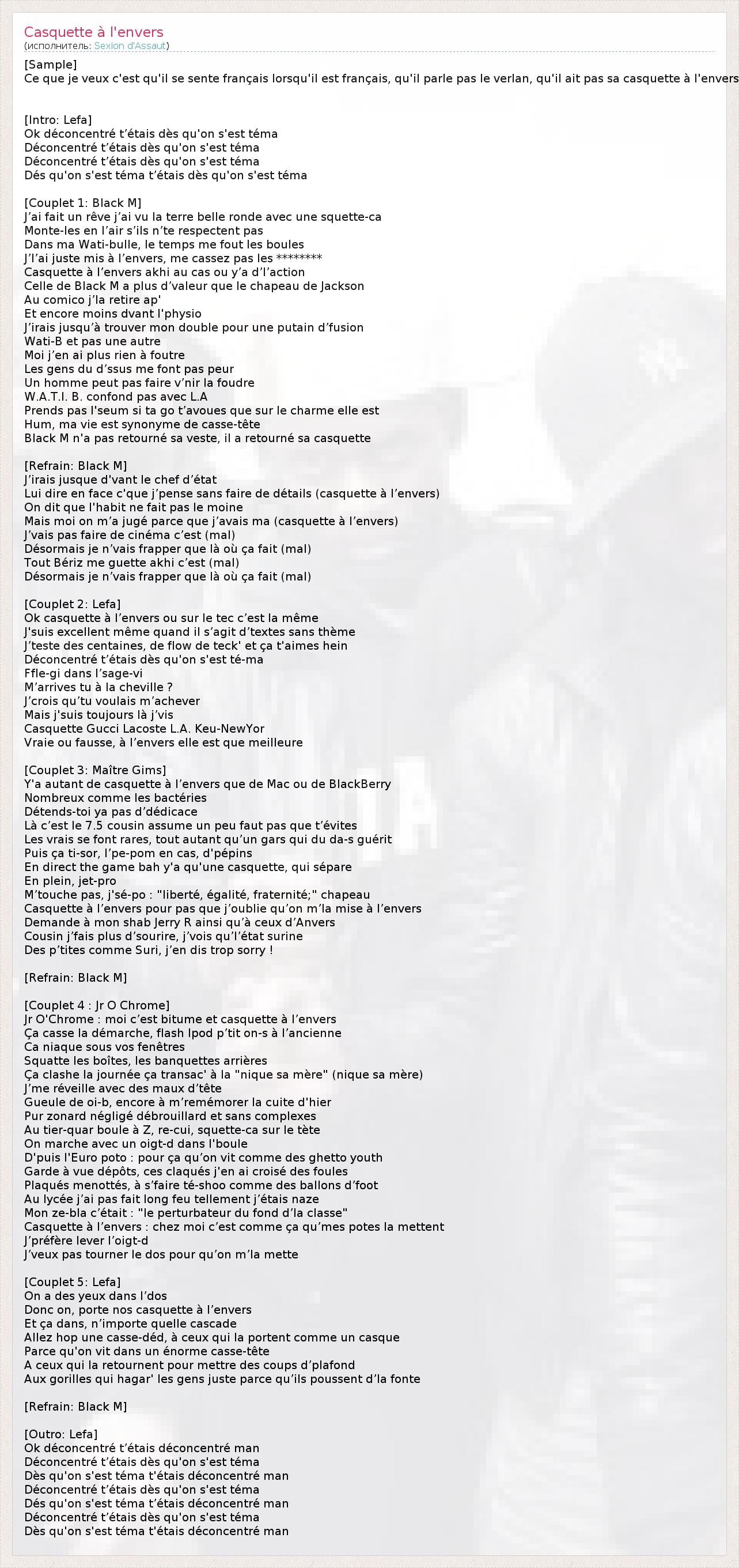 [Sample] Ce que je veux c'est qu'il se sente français lorsqu'il est français, qu'il parle pas le verlan, qu'il ait pas sa casquette à l'envers [Intro: Lefa] Ok déconcentré t’étais dès qu'on s'est téma Déconcentré t’étais dès qu'on s'est téma Déconcentré t’étais dès qu'on s'est téma Dés qu'on s'est téma t’étais dès qu'on s'est téma [Couplet 1: Black M] J’ai fait un rêve j’ai vu la terre belle ronde avec une squette-ca Monte-les en l’air s’ils n’te respectent pas Dans ma Wati-bulle, le temps me fout les boules J’l’ai juste mis à l’envers, me cassez pas les ******** Casquette à l’envers akhi au cas ou y’a d’l’action Celle de Black M a plus d’valeur que le chapeau de Jackson Au comico j’la retire ap' Et encore moins dvant l'physio J’irais jusqu’à trouver mon double pour une putain d’fusion Wati-B et pas une autre Moi j’en ai plus rien à foutre Les gens du d’ssus me font pas peur Un homme peut pas faire v’nir la foudre W.A.T.I. B. confond pas avec L.A Prends pas l'seum si ta go t’avoues que sur le charme elle est Hum, ma vie est synonyme de casse-tête Black M n'a pas retourné sa veste, il a retourné sa casquette [Refrain: Black M] J’irais jusque d'vant le chef d’état Lui dire en face c'que j’pense sans faire de détails (casquette à l’envers) On dit que l'habit ne fait pas le moine Mais moi on m’a jugé parce que j’avais ma (casquette à l’envers) J’vais pas faire de cinéma c’est (mal) Désormais je n’vais frapper que là où ça fait (mal) Tout Bériz me guette akhi c’est (mal) Désormais je n’vais frapper que là où ça fait (mal) [Couplet 2: Lefa] Ok casquette à l’envers ou sur le tec c’est la même J'suis excellent même quand il s’agit d’textes sans thème J’teste des centaines, de flow de teck' et ça t'aimes hein Déconcentré t’étais dès qu'on s'est té-ma Ffle-gi dans l’sage-vi M’arrives tu à la cheville ? J’crois qu’tu voulais m’achever Mais j'suis toujours là j’vis Casquette Gucci Lacoste L.A. Keu-NewYor Vraie ou fausse, à l’envers elle est que meilleure [Couplet 3: Maître Gims] Y'a autant de casquette à l’envers que de Mac ou de BlackBerry Nombreux comme les bactéries Détends-toi ya pas d’dédicace Là c’est le 7.5 cousin assume un peu faut pas que t’évites Les vrais se font rares, tout autant qu’un gars qui du da-s guérit Puis ça ti-sor, l’pe-pom en cas, d'pépins En direct the game bah y'a qu'une casquette, qui sépare En plein, jet-pro M’touche pas, j'sé-po : "liberté, égalité, fraternité;" chapeau Casquette à l’envers pour pas que j’oublie qu’on m’la mise à l’envers Demande à mon shab Jerry R ainsi qu’à ceux d’Anvers Cousin j’fais plus d’sourire, j’vois qu’l’état surine Des p’tites comme Suri, j’en dis trop sorry ! [Refrain: Black M] [Couplet 4 : Jr O Chrome] Jr O'Chrome : moi c’est bitume et casquette à l’envers Ça casse la démarche, flash Ipod p’tit on-s à l’ancienne Ca niaque sous vos fenêtres Squatte les boîtes, les banquettes arrières Ça clashe la journée ça transac' à la "nique sa mère" (nique sa mère) J’me réveille avec des maux d’tête Gueule de oi-b, encore à m’remémorer la cuite d'hier Pur zonard négligé débrouillard et sans complexes Au tier-quar boule à Z, re-cui, squette-ca sur le tète On marche avec un oigt-d dans l'boule D'puis l'Euro poto : pour ça qu’on vit comme des ghetto youth Garde à vue dépôts, ces claqués j'en ai croisé des foules Plaqués menottés, à s’faire té-shoo comme des ballons d’foot Au lycée j’ai pas fait long feu tellement j’étais naze Mon ze-bla c’était : "le perturbateur du fond d’la classe" Casquette à l’envers : chez moi c’est comme ça qu’mes potes la mettent J’préfère lever l’oigt-d J’veux pas tourner le dos pour qu’on m’la mette [Couplet 5: Lefa] On a des yeux dans l’dos Donc on, porte nos casquette à l’envers Et ça dans, n’importe quelle cascade Allez hop une casse-déd, à ceux qui la portent comme un casque Parce qu'on vit dans un énorme casse-tête A ceux qui la retournent pour mettre des coups d’plafond Aux gorilles qui hagar' les gens juste parce qu’ils poussent d’la fonte [Refrain: Black M] [Outro: Lefa] Ok déconcentré t’étais déconcentré man Déconcentré t’étais dès qu'on s'est téma Dès qu'on s'est téma t'étais déconcentré man Déconcentré t’étais dès qu'on s'est téma Dés qu'on s'est téma t’étais déconcentré man Déconcentré t’étais dès qu'on s'est téma Dès qu'on s'est téma t'étais déconcentré man