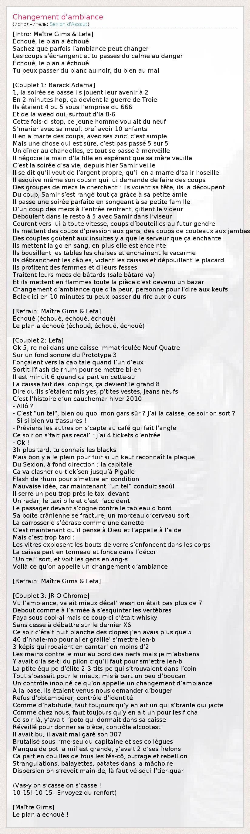 [Intro: Maître Gims & Lefa] Échoué, le plan a échoué Sachez que parfois l’ambiance peut changer Les coups s’échangent et tu passes du calme au danger Échoué, le plan a échoué Tu peux passer du blanc au noir, du bien au mal [Couplet 1: Barack Adama] 1, la soirée se passe ils jouent leur avenir à 2 En 2 minutes hop, ça devient la guerre de Troie Ils étaient 4 ou 5 sous l’emprise du 666 Et de la weed oui, surtout d'la 8-6 Cette fois-ci stop, ce jeune homme voulait du neuf S’marier avec sa meuf, bref avoir 10 enfants Il en a marre des coups, avec ses zinc’ c’est simple Mais une chose qui est sûre, c’est pas passé 5 sur 5 Un dîner au chandelles, et tout se passe à merveille Il négocie la main d'la fille en espérant que sa mère veuille C’est la soirée d'sa vie, depuis hier Samir veille Il se dit qu’il veut de l’argent propre, qu’il en a marre d’salir l’oseille Il esquive même son cousin qui lui demande de faire des coups Des groupes de mecs le cherchent : ils voient sa tête, ils la découpent Du coup, Samir s’est rangé tout ça grâce à sa petite amie Il passe une soirée parfaite en songeant à sa petite famille D’un coup des mecs à l’entrée rentrent, giflent le videur Déboulent dans le resto à 5 avec Samir dans l’viseur Courent vers lui à toute vitesse, coups d’bouteilles au futur gendre Ils mettent des coups d'pression aux gens, des coups de couteaux aux jambes Des couples goûtent aux insultes y a que le serveur que ça enchante Ils mettent la go en sang, en plus elle est enceinte Ils bousillent les tables les chaises et enchaînent le vacarme Ils débranchent les câbles, vident les caisses et dépouillent le placard Ils profitent des femmes et d'leurs fesses Traitent leurs mecs de bâtards (sale bâtard va) Et ils mettent en flammes toute la pièce c'est devenu un bazar Changement d’ambiance que d’la peur, personne pour l'dire aux keufs Belek ici en 10 minutes tu peux passer du rire aux pleurs [Refrain: Maître Gims & Lefa] Échoué (échoué, échoué, échoué) Le plan a échoué (échoué, échoué, échoué) [Couplet 2: Lefa] Ok 5, re-noi dans une caisse immatriculée Neuf-Quatre Sur un fond sonore du Prototype 3 Fonçaient vers la capitale quand l’un d'eux Sortit l’flash de rhum pour se mettre bi-en Il est minuit 6 quand ça part en cette-su La caisse fait des loopings, ça devient le grand 8 Dire qu’ils s’étaient mis yes, p'tites vestes, jeans neufs C’est l’histoire d’un cauchemar hiver 2010 - Allô ? - C’est "un tel", bien ou quoi mon gars sûr ? J’ai la caisse, ce soir on sort ? - Si si bien vu t’assures ! - Préviens les autres on s’capte au café qui fait l’angle Ce soir on s’fait pas recal' : j’ai 4 tickets d’entrée - Ok ! 3h plus tard, tu connais les blacks Mais bon y a le plein pour fuir si un keuf reconnaît la plaque Du Sexion, à fond direction : la capitale Ca va clasher du tiek’son jusqu’à Pigalle Flash de rhum pour s’mettre en condition Mauvaise idée, car maintenant "un tel" conduit saoûl Il serre un peu trop près le taxi devant Un radar, le taxi pile et c’est l’accident Le passager devant s’cogne contre le tableau d’bord Sa boîte crânienne se fracture, un morceau d’cerveau sort La carrosserie s’écrase comme une canette C’est maintenant qu’il pense à Dieu et l'appelle à l'aide Mais c’est trop tard : Les vitres explosent les bouts de verre s’enfoncent dans les corps La caisse part en tonneau et fonce dans l’décor "Un tel" sort, et voit les gens en ang-s Voilà ce qu’on appelle un changement d’ambiance [Refrain: Maître Gims & Lefa] [Couplet 3: JR O Chrome] Vu l’ambiance, valait mieux décal’ wesh on était pas plus de 7 Debout comme à l’armée à s’esquinter les vertèbres Faya sous cool-al mais ce coup-ci c’était whisky Sans cesse à débattre sur le dernier X6 Ce soir c’était nuit blanche des clopes j’en avais plus que 5 4€ d’nnaie-mo pour aller graille' s’mettre ien-b 3 képis qui rodaient en camtar' en moins d’2 Les mains contre le mur au bord des nerfs mais je m’abstiens Y avait d’la se-ti du pilon c’qu’il faut pour sm’ettre ien-b La ptite équipe d’élite 2-3 tits-pe qui s’trouvaient dans l’coin Tout s'passait pour le mieux, mis à part un peu d’boucan Un contrôle inopiné ce qu’on appelle un changement d’ambiance A la base, ils étaient venus nous demander d’bouger Refus d’obtempérer, contrôle d’identité Comme d’habitude, faut toujours qu’y en ait un qui s'branle qui jacte Comme chez nous, faut toujours qu’y en ait un pour les ficha Ce soir là, y’avait l’poto qui dormait dans sa caisse Réveillé pour donner sa pièce, contrôle alcootest Il avait bu, il avait mal garé son 307 Brutalisé sous l’me-seu du capitaine et ses collègues Manque de pot la mif est grande, y’avait 2 d’ses frelons Ca part en couilles de tous les tés-cô, outrage et rebellion Strangulations, balayettes, patates dans la mâchoire Dispersion on s’revoit main-de, là faut vé-squi l’tier-quar (Vas-y on s’casse on s’casse ! 10-15! 10-15! Envoyez du renfort) [Maître Gims] Le plan a échoué !