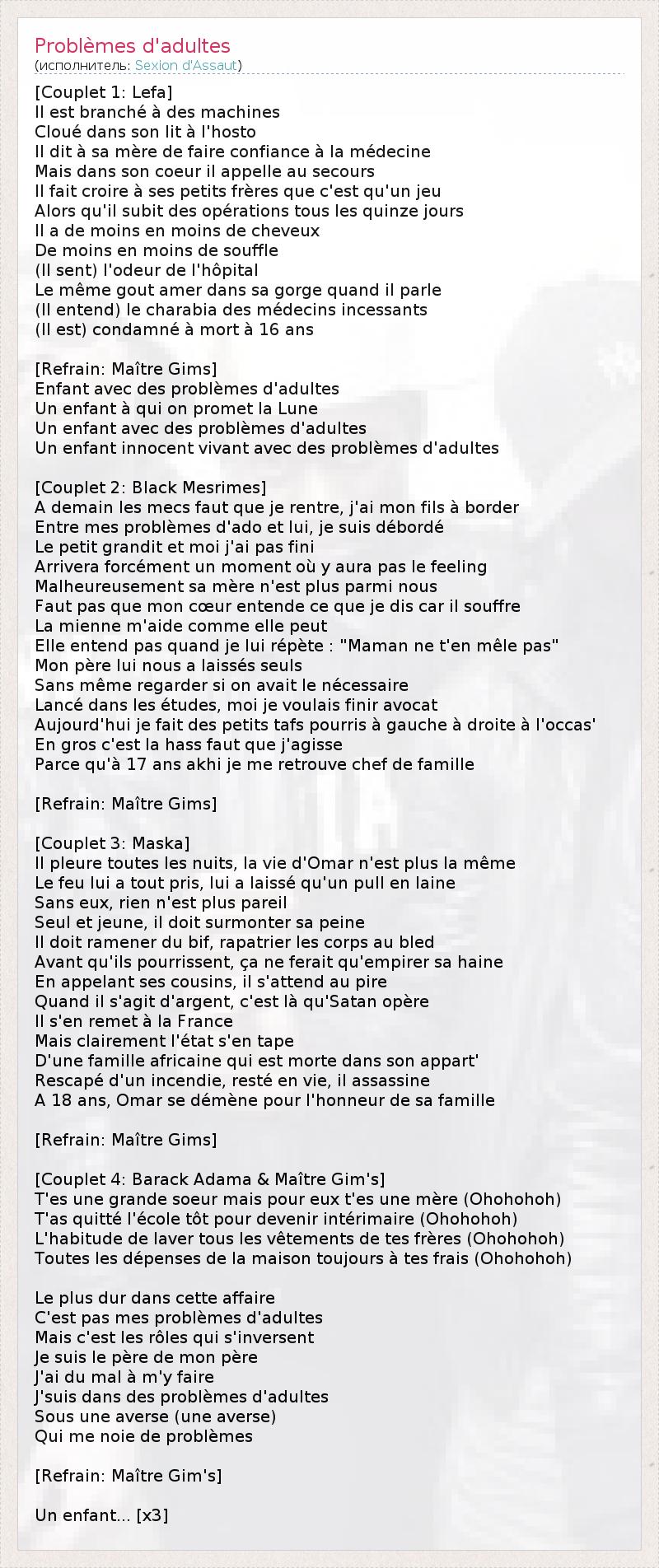 [Куплет 1: Lefa] Он подключен к приборам, Прикован к постели в больнице. Он говорит своей матери довериться лекарствам, Но в глубине души он зовет на помощь. Он заставляет своих младших братишек поверить, что это игра В то время, как переносит операции каждые две недели. У него все меньше и меньше волос, Все меньше и меньше сил. (Он ощущает) запах больницы. Тот же горький вкус в горле, когда он разговаривает. (Он слышит) тарабарщину беспрестанных врачей. (Он) обречен на смерть в 16 лет. [Припев: Maitre Gims] Ребенок со взрослыми проблемами, Ребенок, которому обещают Луну. Ребенок со взрослыми проблемами, Невинный ребенок, живущий со взрослыми проблемами. [Куплет 2: Black Mesrimes] До завтра, парни, мне нужно возвращаться, мне нужно поправить одеяло на постели сына. Я перегружен своими взрослыми проблемами и его трудностями. Малыш растет, и я, я не закончил. Неизбежно настанет момент, когда больше не будет взаимопонимания. К несчастью, его матери больше нет среди нас. Моему сердцу не следует слушать то, что я говорю, ибо оно страдает. Моя мама помогает мне, как может. Она не слушает, когда я ей повторяю: "Мама, не впутывайся в это." Мой отец бросил нас одних, оставив нас ей, Даже не подумав, было ли у нас необходимое. Погруженный в учебу, я хотел выучиться на адвоката. Сегодня я выполняю мелкую дерьмовую работенку налево и направо при удобном случае. В целом, это нищета вынуждает меня действовать, Потому что в 17 лет, брат, я оказываюсь главой семьи. [Припев: Maitre Gims] [Куплет 3: Maska] Он плачет каждую ночь, жизнь Омара больше не та, что прежде. Огонь забрал у него все, не оставил ему ничего, кроме шерстяного свитера. Без них, все уже не так. Одинокий и молодой, он должен превозмочь свою боль Он должен зарабатывать деньги, возвращать тела в родные места Прежде, чем они станут разлагаться, это бы только усилило его злобу. Звоня своим двоюродным братьям, он готовится к худшему. Когда речь идет о деньгах, здесь орудует сатана. Он полагается на Францию, Но ясно, что государству на это плевать. Выходец из африканской семьи, которая умерла в своей квартире, Спасшийся от пожара, оставшийся в живых, он убивает. В 18 лет Омар старается изо всех сил за честь своей семьи. [Припев: Maitre Gims] [Куплет 4: Barack Adama & Maitre Gim's] Ты - старшая сестра, но для них ты мать (О-о-о-о) Ты рано бросила школу, чтобы стать временным работником (О-о-о-о) Привычка стирать всю одежду твоих братьев (О-о-о-о) Все домашние расходы всегда на тебе (О-о-о-о) Самое тяжелое в этом деле - Это не мои взрослые проблемы, А это роли, которые меняются местами. Я отец моего отца. Мне трудно к этому привыкнуть. Я в своих взрослых проблемах Под ливнем (под ливнем), Который топит меня в проблемах. [Припев: Maitre Gim's] Ребенок... [x3]