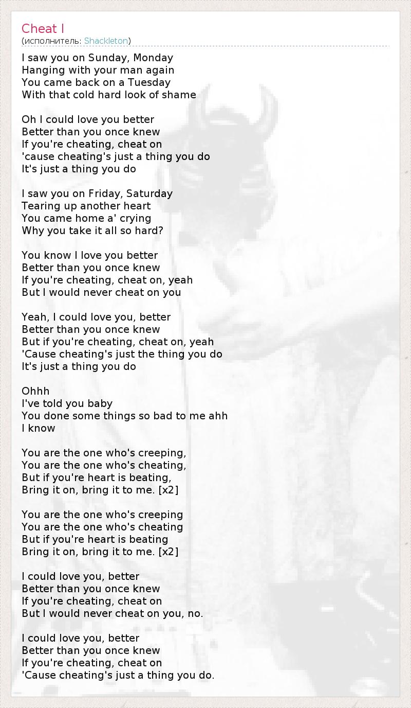 I saw you on Sunday, Monday Hanging with your man again You came back on a Tuesday With that cold hard look of shame Oh I could love you better Better than you once knew If you're cheating, cheat on 'cause cheating's just a thing you do It's just a thing you do I saw you on Friday, Saturday Tearing up another heart You came home a' crying Why you take it all so hard? You know I love you better Better than you once knew If you're cheating, cheat on, yeah But I would never cheat on you Yeah, I could love you, better Better than you once knew But if you're cheating, cheat on, yeah 'Cause cheating's just the thing you do It's just a thing you do Ohhh I've told you baby You done some things so bad to me ahh I know You are the one who's creeping, You are the one who's cheating, But if you're heart is beating, Bring it on, bring it to me. [x2] You are the one who's creeping You are the one who's cheating But if you're heart is beating Bring it on, bring it to me. [x2] I could love you, better Better than you once knew If you're cheating, cheat on But I would never cheat on you, no. I could love you, better Better than you once knew If you're cheating, cheat on 'Cause cheating's just a thing you do.