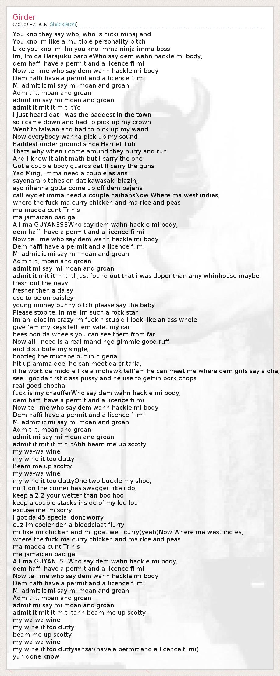 You kno they say who, who is nicki minaj and You kno im like a multiple personality bitch Like you kno im. Im you kno imma ninja imma boss Im, Im da Harajuku barbieWho say dem wahn hackle mi body, dem haffi have a permit and a licence fi mi Now tell me who say dem wahn hackle mi body Dem haffi have a permit and a licence fi mi Mi admit it mi say mi moan and groan Admit it, moan and groan admit mi say mi moan and groan admit it mit it mit itYo I just heard dat i was the baddest in the town so i came down and had to pick up my crown Went to taiwan and had to pick up my wand Now everybody wanna pick up my sound Baddest under ground since Harriet Tub Thats why when i come around they hurry and run And i know it aint math but i carry the one Got a couple body guards dat'll carry the guns Yao Ming, Imma need a couple asians sayonara bitches on dat kawasaki blazin, ayo rihanna gotta come up off dem bajans call wyclef imma need a couple haitiansNow Where ma west indies, where the fuck ma curry chicken and ma rice and peas ma madda cunt Trinis ma jamaican bad gal All ma GUYANESEWho say dem wahn hackle mi body, dem haffi have a permit and a licence fi mi Now tell me who say dem wahn hackle mi body Dem haffi have a permit and a licence fi mi Mi admit it mi say mi moan and groan Admit it, moan and groan admit mi say mi moan and groan admit it mit it mit itI just found out that i was doper than amy whinhouse maybe fresh out the navy fresher then a daisy use to be on baisley young money bunny bitch please say the baby Please stop tellin me, im such a rock star im an idiot im crazy im fuckin stupid i look like an ass whole give 'em my keys tell 'em valet my car bees pon da wheels you can see them from far Now all i need is a real mandingo gimmie good ruff and distribute my single, bootleg the mixtape out in nigeria hit up amma doe, he can meet da critaria, if he work da middle like a mohawk tell'em he can meet me where dem girls say aloha, see i got da first class pussy and he use to gettin pork chops real good chocha fuck is my chaufferWho say dem wahn hackle mi body, dem haffi have a permit and a licence fi mi Now tell me who say dem wahn hackle mi body Dem haffi have a permit and a licence fi mi Mi admit it mi say mi moan and groan Admit it, moan and groan admit mi say mi moan and groan admit it mit it mit itAhh beam me up scotty my wa-wa wine my wine it too dutty Beam me up scotty my wa-wa wine my wine it too duttyOne two buckle my shoe, no 1 on the corner has swagger like i do, keep a 2 2 your wetter than boo hoo keep a couple stacks inside of my lou lou excuse me im sorry i got da 45 special dont worry cuz im cooler den a bloodclaat flurry mi like mi chicken and mi goat well curry(yeah)Now Where ma west indies, where the fuck ma curry chicken and ma rice and peas ma madda cunt Trinis ma jamaican bad gal All ma GUYANESEWho say dem wahn hackle mi body, dem haffi have a permit and a licence fi mi Now tell me who say dem wahn hackle mi body Dem haffi have a permit and a licence fi mi Mi admit it mi say mi moan and groan Admit it, moan and groan admit mi say mi moan and groan admit it mit it mit itahh beam me up scotty my wa-wa wine my wine it too dutty beam me up scotty my wa-wa wine my wine it too duttysahsa:(have a permit and a licence fi mi) yuh done know
