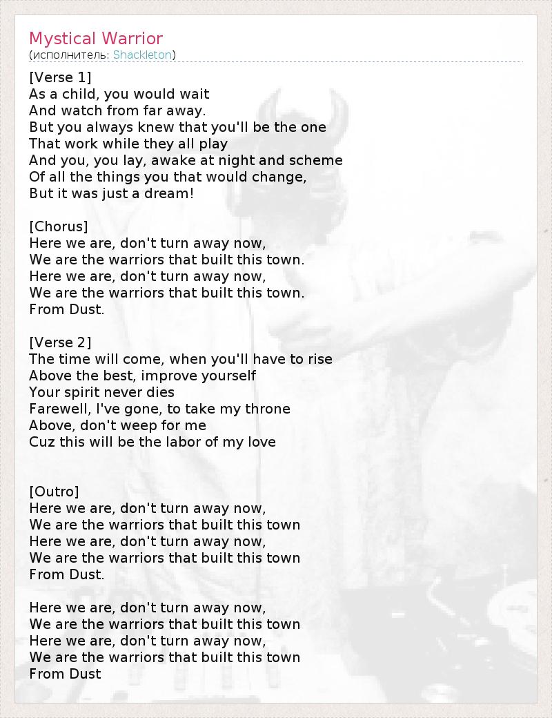 [Verse 1] As a child, you would wait And watch from far away. But you always knew that you'll be the one That work while they all play And you, you lay, awake at night and scheme Of all the things you that would change, But it was just a dream! [Chorus] Here we are, don't turn away now, We are the warriors that built this town. Here we are, don't turn away now, We are the warriors that built this town. From Dust. [Verse 2] The time will come, when you'll have to rise Above the best, improve yourself Your spirit never dies Farewell, I've gone, to take my throne Above, don't weep for me Cuz this will be the labor of my love [Outro] Here we are, don't turn away now, We are the warriors that built this town Here we are, don't turn away now, We are the warriors that built this town From Dust. Here we are, don't turn away now, We are the warriors that built this town Here we are, don't turn away now, We are the warriors that built this town From Dust