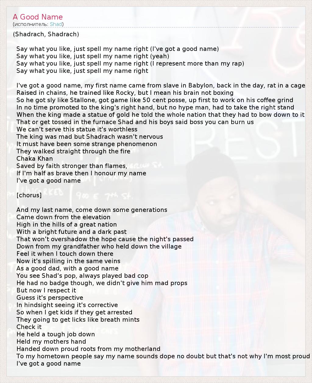(Shadrach, Shadrach) Say what you like, just spell my name right (I've got a good name) Say what you like, just spell my name right (yeah) Say what you like, just spell my name right (I represent more than my rap) Say what you like, just spell my name right I've got a good name, my first name came from slave in Babylon, back in the day, rat in a cage Raised in chains, he trained like Rocky, but I mean his brain not boxing So he got sly like Stallone, got game like 50 cent posse, up first to work on his coffee grind In no time promoted to the king's right hand, but no hype man, had to take the right stand When the king made a statue of gold he told the whole nation that they had to bow down to it That or get tossed in the furnace Shad and his boys said boss you can burn us We can't serve this statue it's worthless The king was mad but Shadrach wasn't nervous It must have been some strange phenomenon They walked straight through the fire Chaka Khan Saved by faith stronger than flames, If I'm half as brave then I honour my name I've got a good name [chorus] And my last name, come down some generations Came down from the elevation High in the hills of a great nation With a bright future and a dark past That won't overshadow the hope cause the night's passed Down from my grandfather who held down the village Feel it when I touch down there Now it's spilling in the same veins As a good dad, with a good name You see Shad's pop, always played bad cop He had no badge though, we didn't give him mad props But now I respect it Guess it's perspective In hindsight seeing it's corrective So when I get kids if they get arrested They going to get licks like breath mints Check it He held a tough job down Held my mothers hand Handed down proud roots from my motherland To my hometown people say my name sounds dope no doubt but that's not why I'm most proud I've got a good name