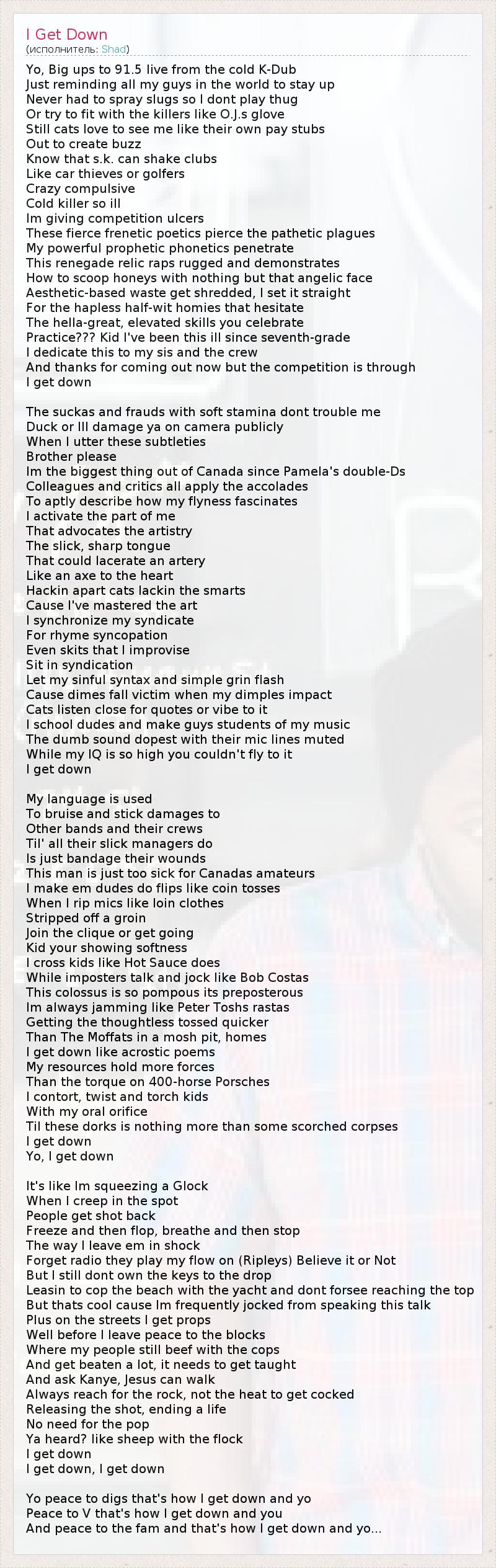 Yo, Big ups to 91.5 live from the cold K-Dub Just reminding all my guys in the world to stay up Never had to spray slugs so I dont play thug Or try to fit with the killers like O.J.s glove Still cats love to see me like their own pay stubs Out to create buzz Know that s.k. can shake clubs Like car thieves or golfers Crazy compulsive Cold killer so ill Im giving competition ulcers These fierce frenetic poetics pierce the pathetic plagues My powerful prophetic phonetics penetrate This renegade relic raps rugged and demonstrates How to scoop honeys with nothing but that angelic face Aesthetic-based waste get shredded, I set it straight For the hapless half-wit homies that hesitate The hella-great, elevated skills you celebrate Practice??? Kid I've been this ill since seventh-grade I dedicate this to my sis and the crew And thanks for coming out now but the competition is through I get down The suckas and frauds with soft stamina dont trouble me Duck or Ill damage ya on camera publicly When I utter these subtleties Brother please Im the biggest thing out of Canada since Pamela's double-Ds Colleagues and critics all apply the accolades To aptly describe how my flyness fascinates I activate the part of me That advocates the artistry The slick, sharp tongue That could lacerate an artery Like an axe to the heart Hackin apart cats lackin the smarts Cause I've mastered the art I synchronize my syndicate For rhyme syncopation Even skits that I improvise Sit in syndication Let my sinful syntax and simple grin flash Cause dimes fall victim when my dimples impact Cats listen close for quotes or vibe to it I school dudes and make guys students of my music The dumb sound dopest with their mic lines muted While my IQ is so high you couldn't fly to it I get down My language is used To bruise and stick damages to Other bands and their crews Til' all their slick managers do Is just bandage their wounds This man is just too sick for Canadas amateurs I make em dudes do flips like coin tosses When I rip mics like loin clothes Stripped off a groin Join the clique or get going Kid your showing softness I cross kids like Hot Sauce does While imposters talk and jock like Bob Costas This colossus is so pompous its preposterous Im always jamming like Peter Toshs rastas Getting the thoughtless tossed quicker Than The Moffats in a mosh pit, homes I get down like acrostic poems My resources hold more forces Than the torque on 400-horse Porsches I contort, twist and torch kids With my oral orifice Til these dorks is nothing more than some scorched corpses I get down Yo, I get down It's like Im squeezing a Glock When I creep in the spot People get shot back Freeze and then flop, breathe and then stop The way I leave em in shock Forget radio they play my flow on (Ripleys) Believe it or Not But I still dont own the keys to the drop Leasin to cop the beach with the yacht and dont forsee reaching the top But thats cool cause Im frequently jocked from speaking this talk Plus on the streets I get props Well before I leave peace to the blocks Where my people still beef with the cops And get beaten a lot, it needs to get taught And ask Kanye, Jesus can walk Always reach for the rock, not the heat to get cocked Releasing the shot, ending a life No need for the pop Ya heard? like sheep with the flock I get down I get down, I get down Yo peace to digs that's how I get down and yo Peace to V that's how I get down and you And peace to the fam and that's how I get down and yo...
