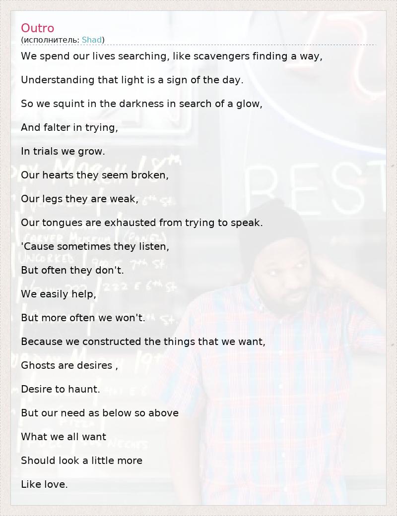 Это интересно:Shadrach Kabango родился 18 июля 1982 в Кении, позже переехал в Лондон. Учился в Лондонской Центральной Средней Школе. Имеет два высших образования. В 2005 выпустил свой первый альбом When This Is Over, записанный на деньги, выигранные в университетском конкурсе талантов. Имеет два высших образования. В 2007 был подписан на Black Box Recordings и выпустил свой второй альбом The Old Prince, который получил номинацию на премию... продолжение