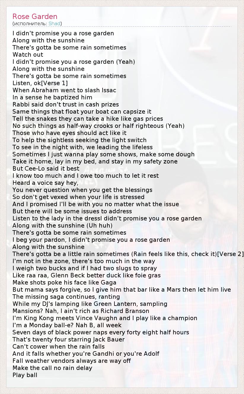 I didn't promise you a rose garden Along with the sunshine There's gotta be some rain sometimes Watch out I didn't promise you a rose garden (Yeah) Along with the sunshine There's gotta be some rain sometimes Listen, ok[Verse 1] When Abraham went to slash Issac In a sense he baptized him Rabbi said don't trust in cash prizes Same things that float your boat can capsize it Tell the snakes they can take a hike like gas prices No such things as half-way crooks or half righteous (Yeah) Those who have eyes should act like it To help the sightless seeking the light switch To see in the night with, we leading the lifeless Sometimes I just wanna play some shows, make some dough Take it home, lay in my bed, and stay in my safety zone But Cee-Lo said it best I know too much and I owe too much to let it rest Heard a voice say hey, You never question when you get the blessings So don't get vexed when your life is stressed And I promised I'll be with you no matter what the issue But there will be some issues to address Listen to the lady in the dressI didn't promise you a rose garden Along with the sunshine (Uh huh) There's gotta be some rain sometimes I beg your pardon, I didn't promise you a rose garden Along with the sunshine There's gotta be a little rain sometimes (Rain feels like this, check it)[Verse 2] I'm not in the zone, there's too much in the way I weigh two bucks and if I had two slugs to spray Like raa raa, Glenn Beck better duck like foie gras Make shots poke his face like Gaga But mama says forgive, so I give him that bar like a Mars then let him live The missing saga continues, ranting While my DJ's lamping like Green Lantern, sampling Mansions? Nah, I ain't rich as Richard Branson I'm King Kong meets Vince Vaughn and I play like a champion I'm a Monday ball-e? Nah B, all week Seven days of black power naps every forty eight half hours That's twenty four starring Jack Bauer Can't cower when the rain falls And it falls whether you're Gandhi or you're Adolf Fall weather vendors always are way off Make the call no rain delay Play ball