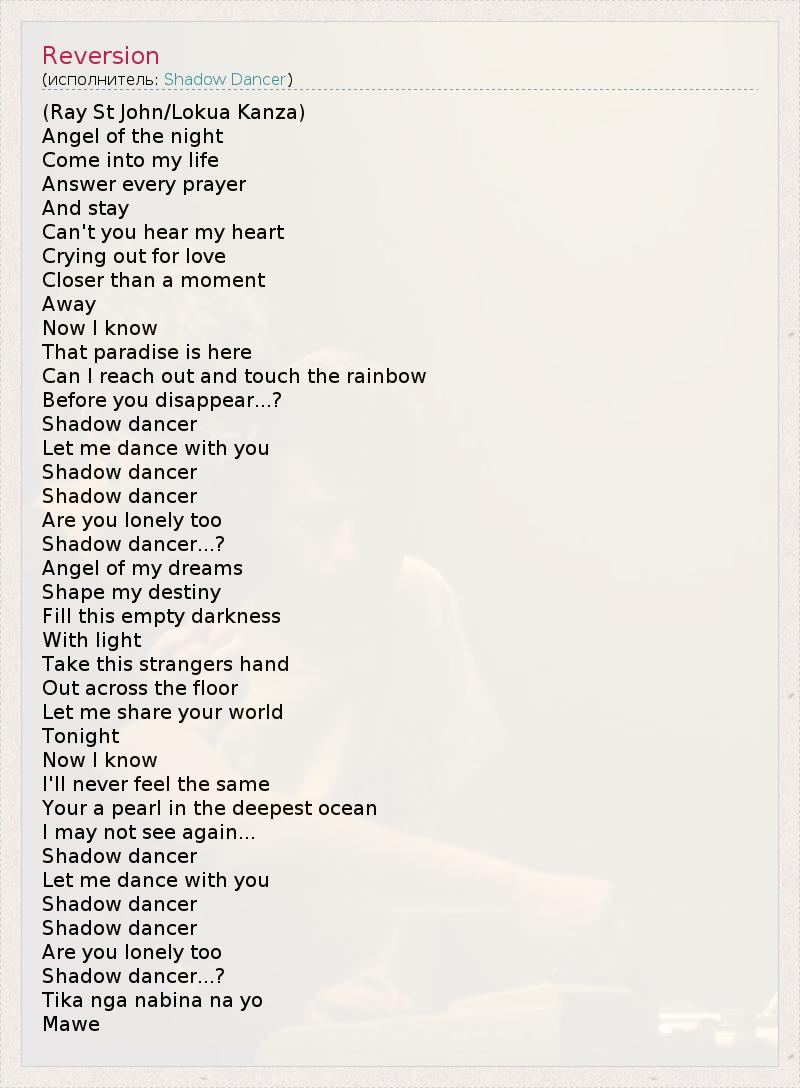 (Ray St John/Lokua Kanza) Angel of the night Come into my life Answer every prayer And stay Can't you hear my heart Crying out for love Closer than a moment Away Now I know That paradise is here Can I reach out and touch the rainbow Before you disappear...? Shadow dancer Let me dance with you Shadow dancer Shadow dancer Are you lonely too Shadow dancer...? Angel of my dreams Shape my destiny Fill this empty darkness With light Take this strangers hand Out across the floor Let me share your world Tonight Now I know I'll never feel the same Your a pearl in the deepest ocean I may not see again... Shadow dancer Let me dance with you Shadow dancer Shadow dancer Are you lonely too Shadow dancer...? Tika nga nabina na yo Mawe