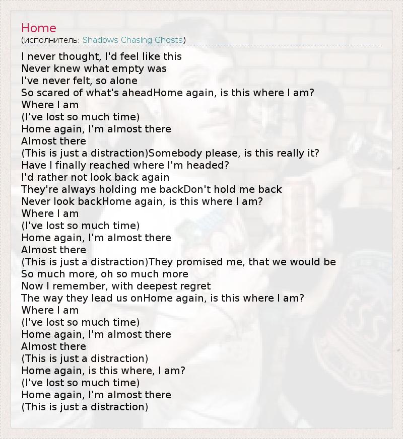 I never thought, I'd feel like this Never knew what empty was I've never felt, so alone So scared of what's aheadHome again, is this where I am? Where I am (I've lost so much time) Home again, I'm almost there Almost there (This is just a distraction)Somebody please, is this really it? Have I finally reached where I'm headed? I'd rather not look back again They're always holding me backDon't hold me back Never look backHome again, is this where I am? Where I am (I've lost so much time) Home again, I'm almost there Almost there (This is just a distraction)They promised me, that we would be So much more, oh so much more Now I remember, with deepest regret The way they lead us onHome again, is this where I am? Where I am (I've lost so much time) Home again, I'm almost there Almost there (This is just a distraction) Home again, is this where, I am? (I've lost so much time) Home again, I'm almost there (This is just a distraction)