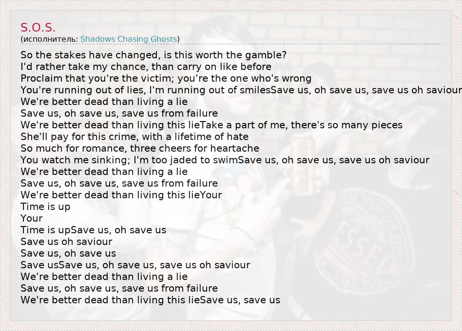 You're running out of lies, I'm running out of smilesSave us, oh save us, save us oh saviour