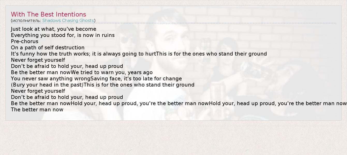 Just look at what, you've become Everything you stood for, is now in ruins Pre-chorus On a path of self destruction It's funny how the truth works; it is always going to hurtThis is for the ones who stand their ground Never forget yourself Don't be afraid to hold your, head up proud Be the better man nowWe tried to warn you, years ago You never saw anything wrongSaving face, it's too late for change (Bury your head in the past)This is for the ones who stand their ground Never forget yourself Don't be afraid to hold your, head up proud Be the better man nowHold your, head up proud, you're the better man nowHold your, head up proud, you're the better man now The better man now