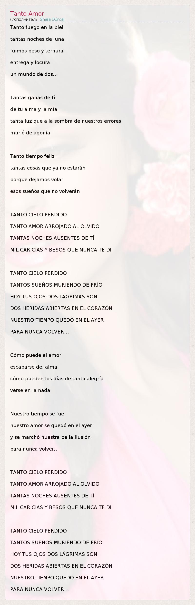 Tanto fuego en la piel tantas noches de luna fuimos beso y ternura entrega y locura un mundo de dos… Tantas ganas de tí de tu alma y la mía tanta luz que a la sombra de nuestros errores murió de agonía Tanto tiempo feliz tantas cosas que ya no estarán porque dejamos volar esos sueños que no volverán TANTO CIELO PERDIDO TANTO AMOR ARROJADO AL OLVIDO TANTAS NOCHES AUSENTES DE TÍ MIL CARICIAS Y BESOS QUE NUNCA TE DI TANTO CIELO PERDIDO TANTOS SUEÑOS MURIENDO DE FRÍO HOY TUS OJOS DOS LÁGRIMAS SON DOS HERIDAS ABIERTAS EN EL CORAZÓN NUESTRO TIEMPO QUEDÓ EN EL AYER PARA NUNCA VOLVER… Cómo puede el amor escaparse del alma cómo pueden los días de tanta alegría verse en la nada Nuestro tiempo se fue nuestro amor se quedó en el ayer y se marchó nuestra bella ilusión para nunca volver… TANTO CIELO PERDIDO TANTO AMOR ARROJADO AL OLVIDO TANTAS NOCHES AUSENTES DE TÍ MIL CARICIAS Y BESOS QUE NUNCA TE DI TANTO CIELO PERDIDO TANTOS SUEÑOS MURIENDO DE FRÍO HOY TUS OJOS DOS LÁGRIMAS SON DOS HERIDAS ABIERTAS EN EL CORAZÓN NUESTRO TIEMPO QUEDÓ EN EL AYER PARA NUNCA VOLVER…