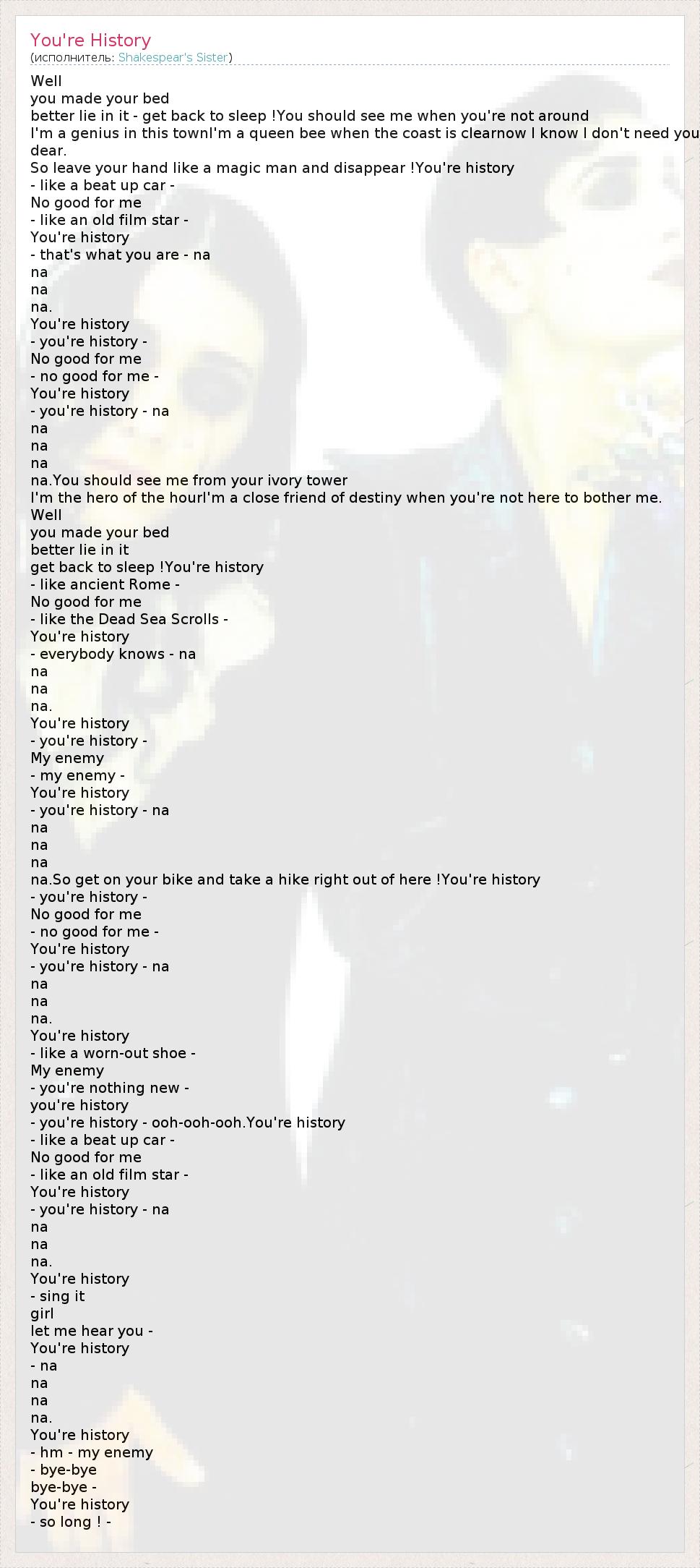 Это интересно:Лондонский коллектив, сформированный Siobhan Fahey, участницей известного коллектива Bananarama, в 1988 году. Она сама сочинила песенный материал и в октябре 1988-го выпустила сингл "Break My Heart (You Really)"/"Heroine". А в 1989 году проект стал дуэтом, когда к нему присоединилась американка Marcella Detroit. В 1989 году уже с участием Марселлы вышел сингл "You're History", который попал в первую десятку британских... продолжение