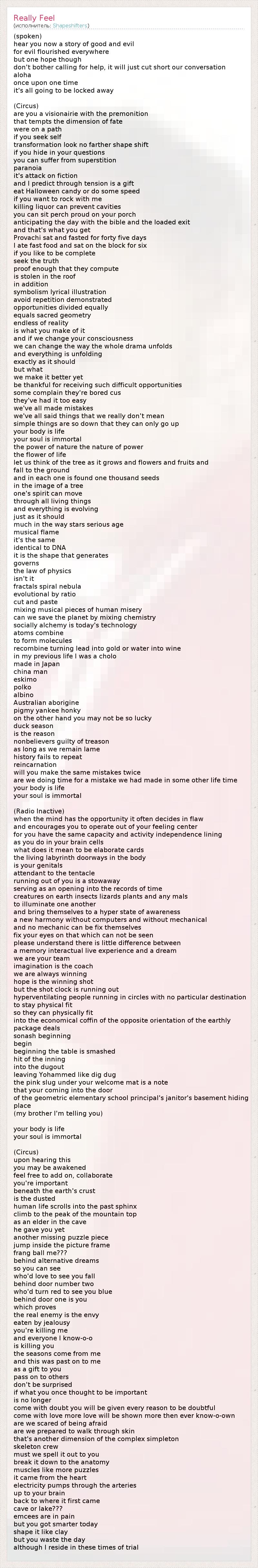 (spoken) hear you now a story of good and evil for evil flourished everywhere but one hope though don't bother calling for help, it will just cut short our conversation aloha once upon one time it's all going to be locked away (Circus) are you a visionairie with the premonition that tempts the dimension of fate were on a path if you seek self transformation look no farther shape shift if you hide in your questions you can suffer from superstition paranoia it's attack on fiction and I predict through tension is a gift eat Halloween candy or do some speed if you want to rock with me killing liquor can prevent cavities you can sit perch proud on your porch anticipating the day with the bible and the loaded exit and that's what you get Provachi sat and fasted for forty five days I ate fast food and sat on the block for six if you like to be complete seek the truth proof enough that they compute is stolen in the roof in addition symbolism lyrical illustration avoid repetition demonstrated opportunities divided equally equals sacred geometry endless of reality is what you make of it and if we change your consciousness we can change the way the whole drama unfolds and everything is unfolding exactly as it should but what we make it better yet be thankful for receiving such difficult opportunities some complain they're bored cus they've had it too easy we've all made mistakes we've all said things that we really don't mean simple things are so down that they can only go up your body is life your soul is immortal the power of nature the nature of power the flower of life let us think of the tree as it grows and flowers and fruits and fall to the ground and in each one is found one thousand seeds in the image of a tree one's spirit can move through all living things and everything is evolving just as it should much in the way stars serious age musical flame it's the same identical to DNA it is the shape that generates governs the law of physics isn't it fractals spiral nebula evolutional by ratio cut and paste mixing musical pieces of human misery can we save the planet by mixing chemistry socially alchemy is today's technology atoms combine to form molecules recombine turning lead into gold or water into wine in my previous life I was a cholo made in Japan china man eskimo polko albino Australian aborigine pigmy yankee honky on the other hand you may not be so lucky duck season is the reason nonbelievers guilty of treason as long as we remain lame history fails to repeat reincarnation will you make the same mistakes twice are we doing time for a mistake we had made in some other life time your body is life your soul is immortal (Radio Inactive) when the mind has the opportunity it often decides in flaw and encourages you to operate out of your feeling center for you have the same capacity and activity independence lining as you do in your brain cells what does it mean to be elaborate cards the living labyrinth doorways in the body is your genitals attendant to the tentacle running out of you is a stowaway serving as an opening into the records of time creatures on earth insects lizards plants and any mals to illuminate one another and bring themselves to a hyper state of awareness a new harmony without computers and without mechanical and no mechanic can be fix themselves fix your eyes on that which can not be seen please understand there is little difference between a memory interactual live experience and a dream we are your team imagination is the coach we are always winning hope is the winning shot but the shot clock is running out hyperventilating people running in circles with no particular destination to stay physical fit so they can physically fit into the economical coffin of the opposite orientation of the earthly package deals sonash beginning begin beginning the table is smashed hit of the inning into the dugout leaving Yohammed like dig dug the pink slug under your welcome mat is a note that your coming into the door of the geometric elementary school principal's janitor's basement hiding place (my brother I'm telling you) your body is life your soul is immortal (Circus) upon hearing this you may be awakened feel free to add on, collaborate you're important beneath the earth's crust is the dusted human life scrolls into the past sphinx climb to the peak of the mountain top as an elder in the cave he gave you yet another missing puzzle piece jump inside the picture frame frang ball me??? behind alternative dreams so you can see who'd love to see you fall behind door number two who'd turn red to see you blue behind door one is you which proves the real enemy is the envy eaten by jealousy you're killing me and everyone I know-o-o is killing you the seasons come from me and this was past on to me as a gift to you pass on to others don't be surprised if what you once thought to be important is no longer come with doubt you will be given every reason to be doubtful come with love more love will be shown more then ever know-o-own are we scared of being afraid are we prepared to walk through skin that's another dimension of the complex simpleton skeleton crew must we spell it out to you break it down to the anatomy muscles like more puzzles it came from the heart electricity pumps through the arteries up to your brain back to where it first came cave or lake??? emcees are in pain but you got smarter today shape it like clay but you waste the day although I reside in these times of trial