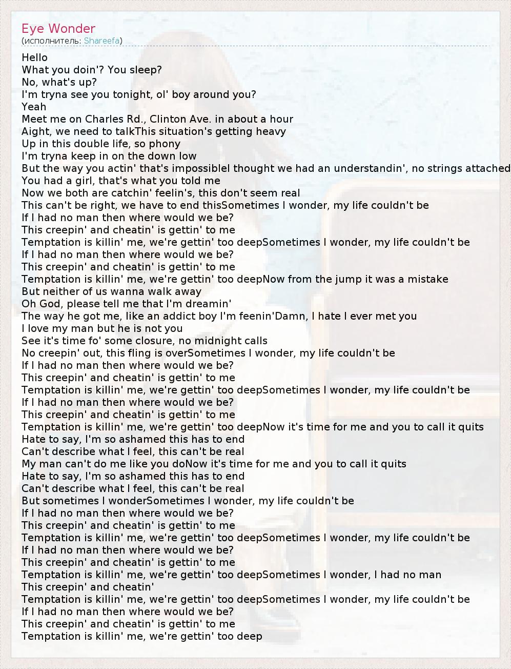 Hello What you doin'? You sleep? No, what's up? I'm tryna see you tonight, ol' boy around you? Yeah Meet me on Charles Rd., Clinton Ave. in about a hour Aight, we need to talkThis situation's getting heavy Up in this double life, so phony I'm tryna keep in on the down low But the way you actin' that's impossibleI thought we had an understandin', no strings attached You had a girl, that's what you told me Now we both are catchin' feelin's, this don't seem real This can't be right, we have to end thisSometimes I wonder, my life couldn't be If I had no man then where would we be? This creepin' and cheatin' is gettin' to me Temptation is killin' me, we're gettin' too deepSometimes I wonder, my life couldn't be If I had no man then where would we be? This creepin' and cheatin' is gettin' to me Temptation is killin' me, we're gettin' too deepNow from the jump it was a mistake But neither of us wanna walk away Oh God, please tell me that I'm dreamin' The way he got me, like an addict boy I'm feenin'Damn, I hate I ever met you I love my man but he is not you See it's time fo' some closure, no midnight calls No creepin' out, this fling is overSometimes I wonder, my life couldn't be If I had no man then where would we be? This creepin' and cheatin' is gettin' to me Temptation is killin' me, we're gettin' too deepSometimes I wonder, my life couldn't be If I had no man then where would we be? This creepin' and cheatin' is gettin' to me Temptation is killin' me, we're gettin' too deepNow it's time for me and you to call it quits Hate to say, I'm so ashamed this has to end Can't describe what I feel, this can't be real My man can't do me like you doNow it's time for me and you to call it quits Hate to say, I'm so ashamed this has to end Can't describe what I feel, this can't be real But sometimes I wonderSometimes I wonder, my life couldn't be If I had no man then where would we be? This creepin' and cheatin' is gettin' to me Temptation is killin' me, we're gettin' too deepSometimes I wonder, my life couldn't be If I had no man then where would we be? This creepin' and cheatin' is gettin' to me Temptation is killin' me, we're gettin' too deepSometimes I wonder, I had no man This creepin' and cheatin' Temptation is killin' me, we're gettin' too deepSometimes I wonder, my life couldn't be If I had no man then where would we be? This creepin' and cheatin' is gettin' to me Temptation is killin' me, we're gettin' too deep